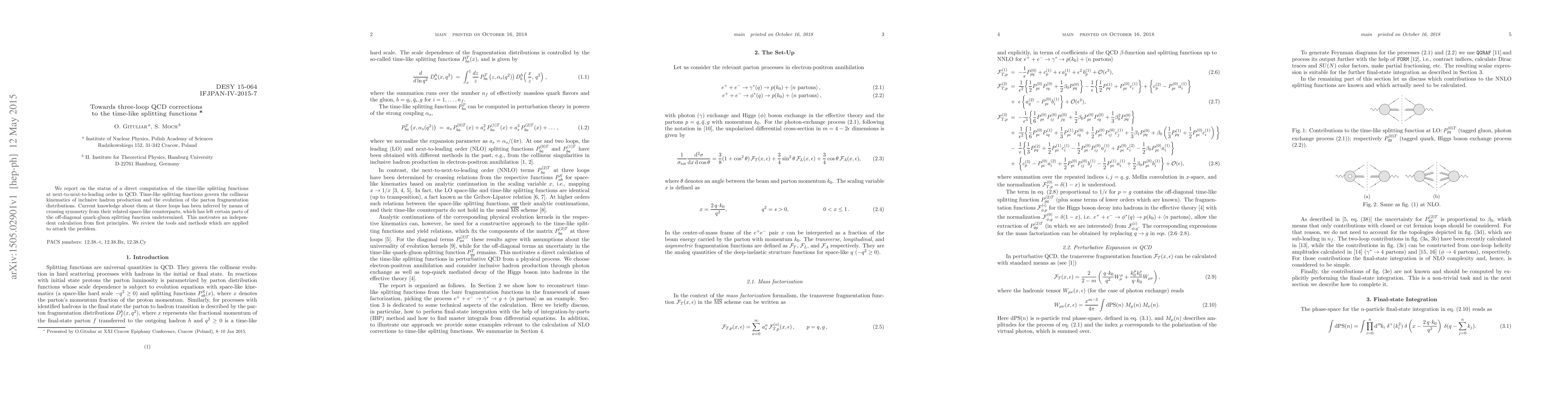 We report on the status of a direct computation of the time-like splitting functions at next-to-next-to-leading order in QCD. Time-like splitting functions govern the collinear kinematics of inclusive hadron production and the evolution of the parton fragmentation distributions. Current knowledge about them at three loops has been inferred by means of crossing symmetry from their related space-like counterparts, which has left certain parts of the off-diagonal quark-gluon splitting function undetermined. This motivates an independent calculation from first principles. We review the tools and methods which are applied to attack the problem.