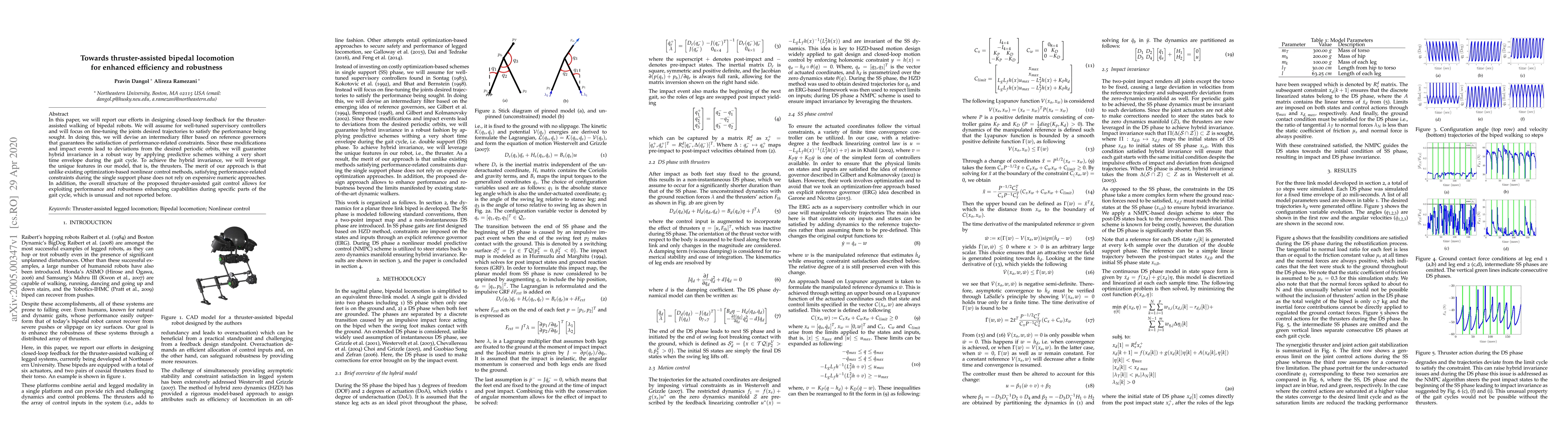 In this paper, we will report our efforts in designing closed-loop feedback for the thruster-assisted walking of bipedal robots. We will assume for well-tuned supervisory controllers and will focus on fine-tuning the joints desired trajectories to satisfy the performance being sought. In doing this, we will devise an intermediary filter based on reference governors that guarantees the satisfaction of performance-related constraints. Since these modifications and impact events lead to deviations from the desired periodic orbits, we will guarantee hybrid invariance in a robust way by applying predictive schemes withing a very short time envelope during the gait cycle. To achieve the hybrid invariance, we will leverage the unique features in our model, that is, the thrusters. The merit of our approach is that unlike existing optimization-based nonlinear control methods, satisfying performance-related constraints during the single support phase does not rely on expensive numeric approaches. In addition, the overall structure of the proposed thruster-assisted gait control allows for exploiting performance and robustness enhancing capabilities during specific parts of the gait cycle, which is unusual and not reported before.