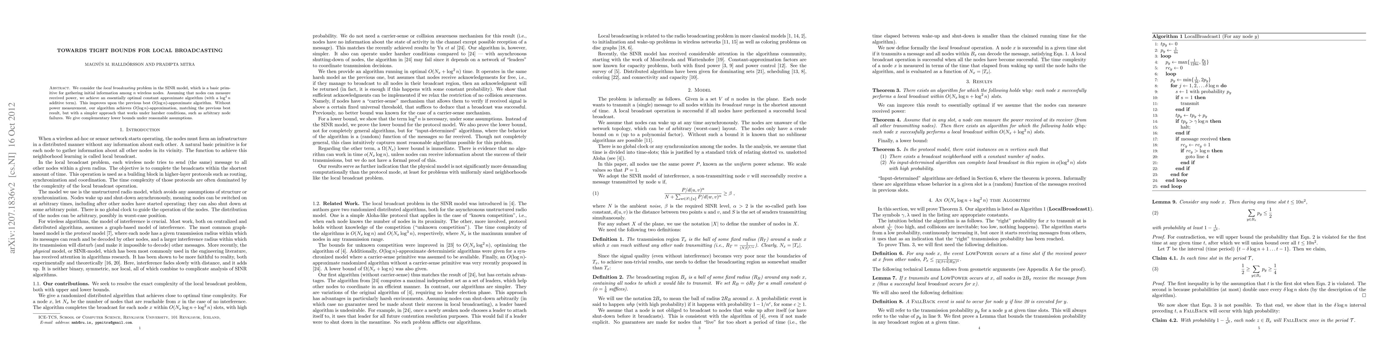 We consider the local broadcasting problem in the SINR model, which is a basic primitive for gathering initial information among $n$ wireless nodes. Assuming that nodes can measure received power, we achieve an essentially optimal constant approximate algorithm (with a $\log^2 n$ additive term). This improves upon the previous best $O(\log n)$-approximate algorithm. Without power measurement, our algorithm achieves $O(\log n)$-approximation, matching the previous best result, but with a simpler approach that works under harsher conditions, such as arbitrary node failures. We give complementary lower bounds under reasonable assumptions.
