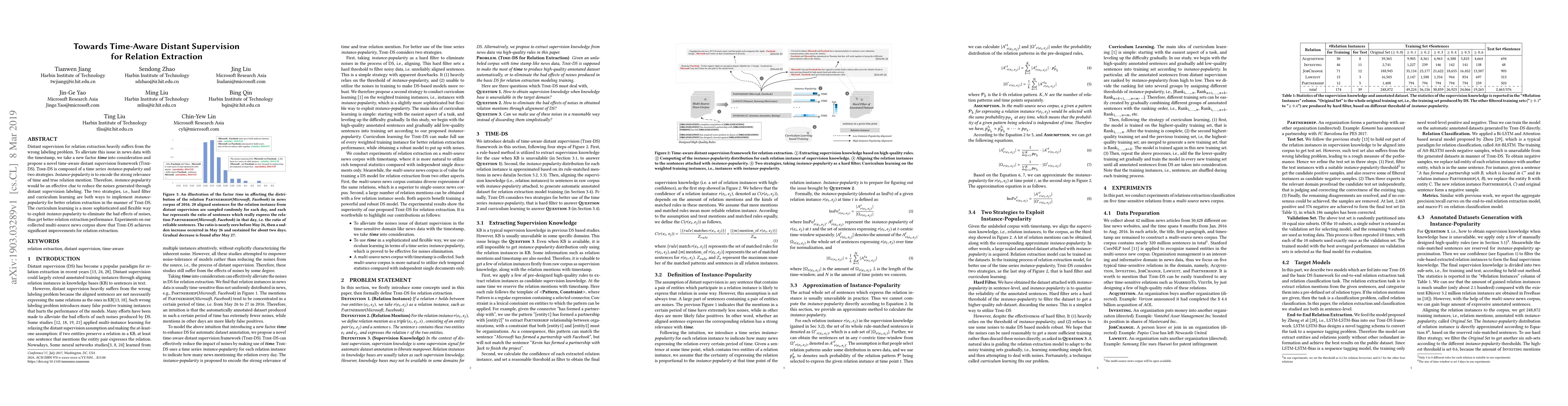 This paper introduces Time-DS, a time-aware distant supervision framework to improve relation extraction in news data. It utilizes instance-popularity and two strategies—hard filter and curriculum learning—to reduce labeling noise, significantly enhancing performance compared to traditional methods.