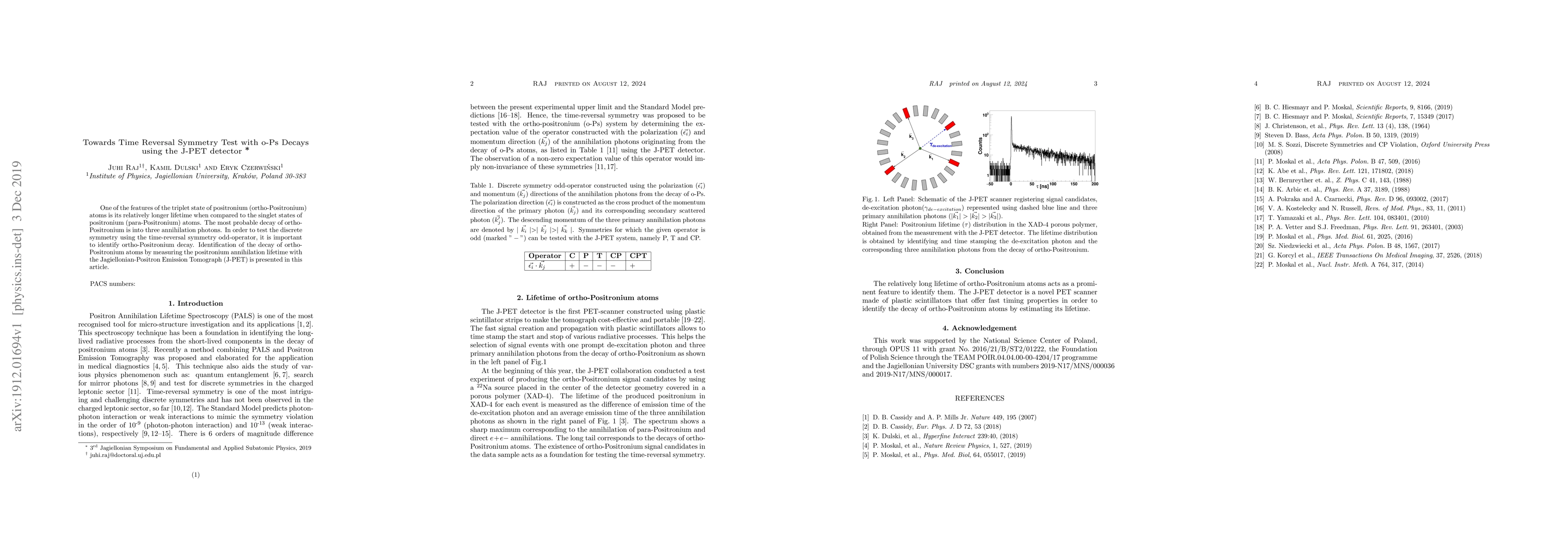 One of the features of the triplet state of positronium (ortho-Positronium)atoms is its relatively longer lifetime when compared to the singlet states ofpositronium (para-Positronium) atoms. The most probable decay of ortho-Positronium is into three annihilation photons. In order to test the discretesymmetry using the time-reversal symmetry odd-operator, it is importantto identify ortho-Positronium decay. Identification of the decay of ortho-Positronium atoms by measuring the positronium annihilation lifetime withthe Jagiellonian-Positron Emission Tomograph (J-PET) is presented in this article.