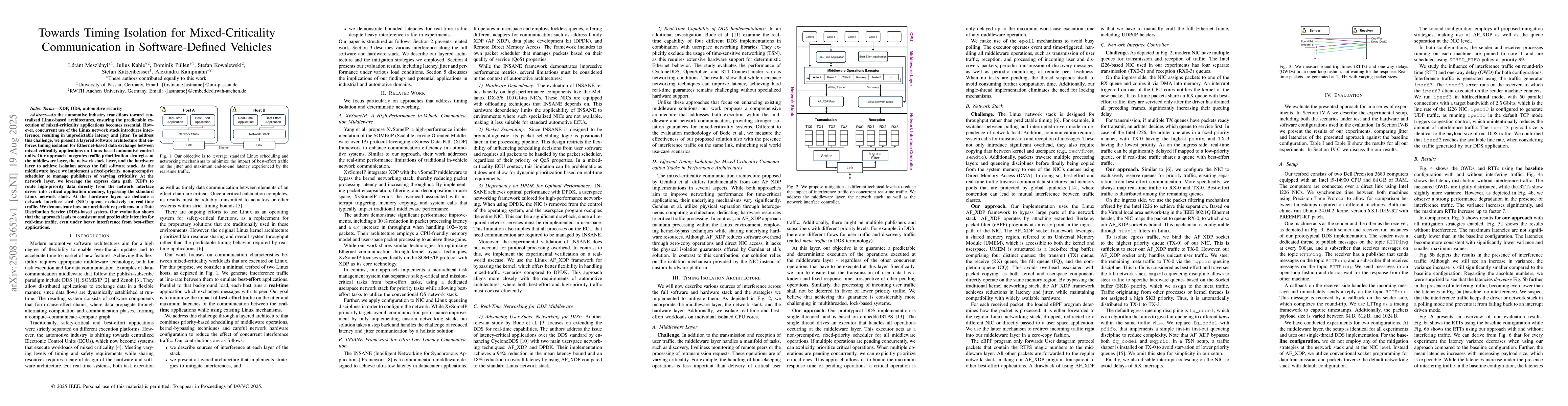 A timing isolation architecture for XDP-based communication was proposed, combining middleware, network stack, and hardware isolation techniques to achieve predictable and low-latency communication.