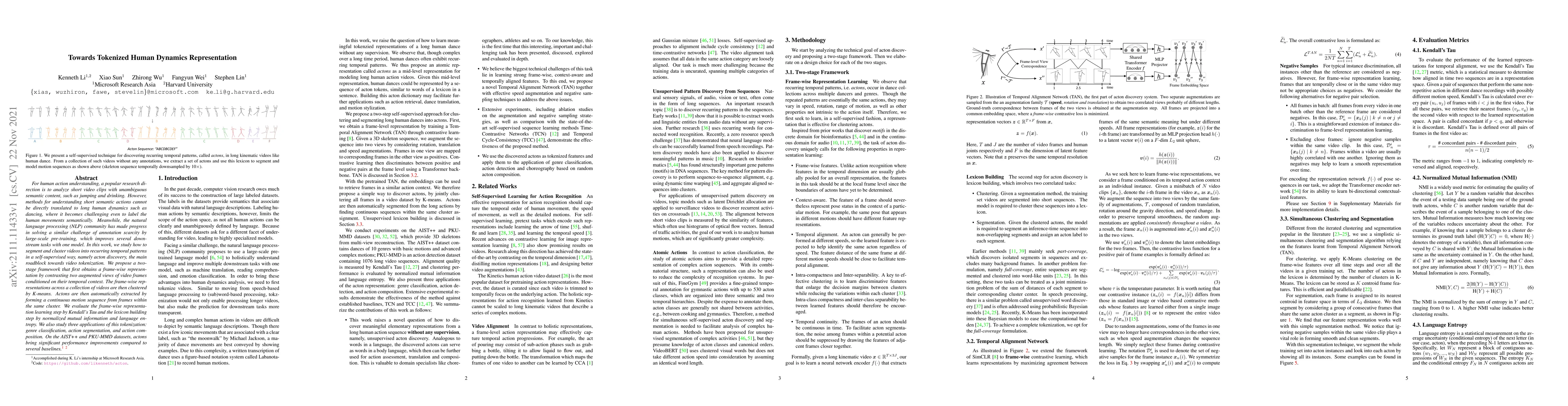 For human action understanding, a popular research direction is to analyze short video clips with unambiguous semantic content, such as jumping and drinking. However, methods for understanding short semantic actions cannot be directly translated to long human dynamics such as dancing, where it becomes challenging even to label the human movements semantically. Meanwhile, the natural language processing (NLP) community has made progress in solving a similar challenge of annotation scarcity by large-scale pre-training, which improves several downstream tasks with one model. In this work, we study how to segment and cluster videos into recurring temporal patterns in a self-supervised way, namely acton discovery, the main roadblock towards video tokenization. We propose a two-stage framework that first obtains a frame-wise representation by contrasting two augmented views of video frames conditioned on their temporal context. The frame-wise representations across a collection of videos are then clustered by K-means. Actons are then automatically extracted by forming a continuous motion sequence from frames within the same cluster. We evaluate the frame-wise representation learning step by Kendall's Tau and the lexicon building step by normalized mutual information and language entropy. We also study three applications of this tokenization: genre classification, action segmentation, and action composition. On the AIST++ and PKU-MMD datasets, actons bring significant performance improvements compared to several baselines.
