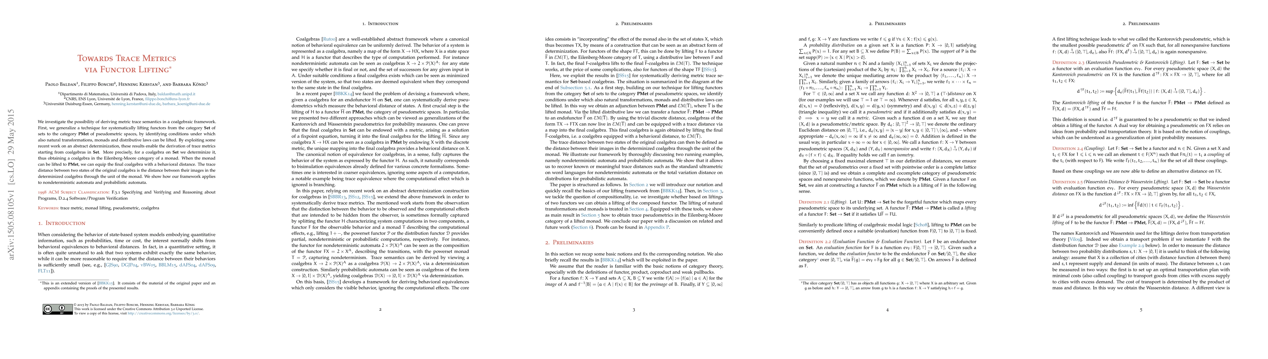 Researchers develop a method to derive metric trace semantics in coalgebras using functor lifting, enabling behavioral distances between states in nondeterministic and probabilistic automata.