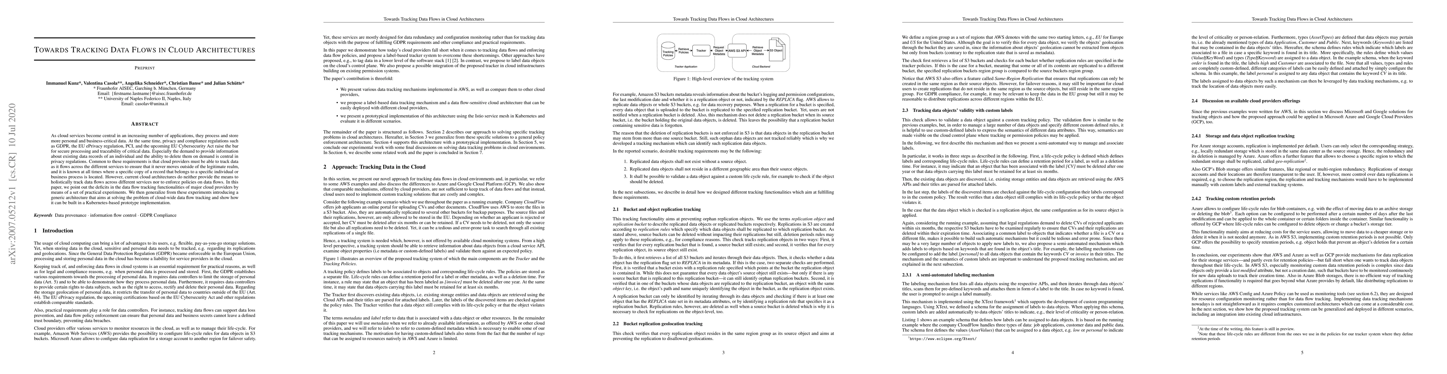 As cloud services become central in an increasing number of applications, they process and store more personal and business-critical data. At the same time, privacy and compliance regulations such as GDPR, the EU ePrivacy regulation, PCI, and the upcoming EU Cybersecurity Act raise the bar for secure processing and traceability of critical data. Especially the demand to provide information about existing data records of an individual and the ability to delete them on demand is central in privacy regulations. Common to these requirements is that cloud providers must be able to track data as it flows across the different services to ensure that it never moves outside of the legitimate realm, and it is known at all times where a specific copy of a record that belongs to a specific individual or business process is located. However, current cloud architectures do neither provide the means to holistically track data flows across different services nor to enforce policies on data flows. In this paper, we point out the deficits in the data flow tracking functionalities of major cloud providers by means of a set of practical experiments. We then generalize from these experiments introducing a generic architecture that aims at solving the problem of cloud-wide data flow tracking and show how it can be built in a Kubernetes-based prototype implementation.