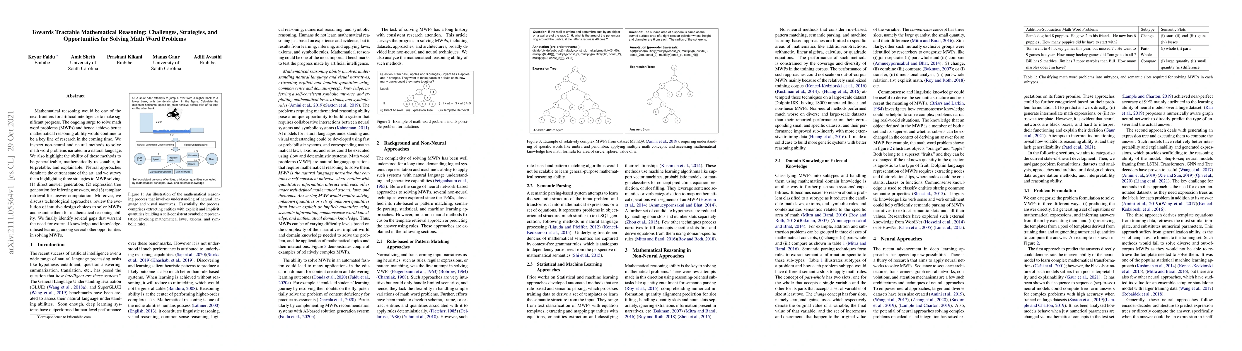 This paper surveys both non-neural and neural methods for solving math word problems, emphasizing the strategies of direct answer generation, expression tree generation, and template retrieval. It highlights the need for generalizability, interpretability, and external knowledge to advance mathematical reasoning in AI.