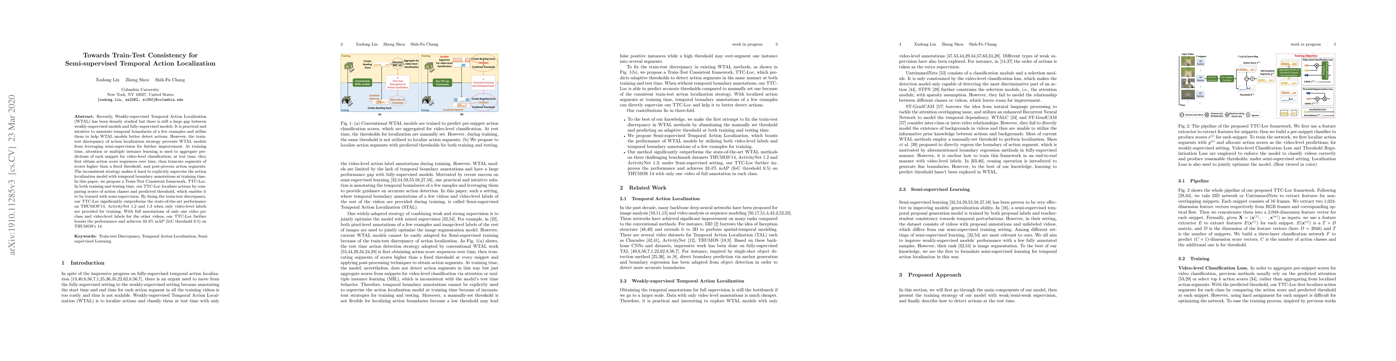 Recently, Weakly-supervised Temporal Action Localization (WTAL) has been densely studied but there is still a large gap between weakly-supervised models and fully-supervised models. It is practical and intuitive to annotate temporal boundaries of a few examples and utilize them to help WTAL models better detect actions. However, the train-test discrepancy of action localization strategy prevents WTAL models from leveraging semi-supervision for further improvement. At training time, attention or multiple instance learning is used to aggregate predictions of each snippet for video-level classification; at test time, they first obtain action score sequences over time, then truncate segments of scores higher than a fixed threshold, and post-process action segments. The inconsistent strategy makes it hard to explicitly supervise the action localization model with temporal boundary annotations at training time. In this paper, we propose a Train-Test Consistent framework, TTC-Loc. In both training and testing time, our TTC-Loc localizes actions by comparing scores of action classes and predicted threshold, which enables it to be trained with semi-supervision. By fixing the train-test discrepancy, our TTC-Loc significantly outperforms the state-of-the-art performance on THUMOS'14, ActivityNet 1.2 and 1.3 when only video-level labels are provided for training. With full annotations of only one video per class and video-level labels for the other videos, our TTC-Loc further boosts the performance and achieves 33.4\% mAP (IoU threshold 0.5) on THUMOS's 14.