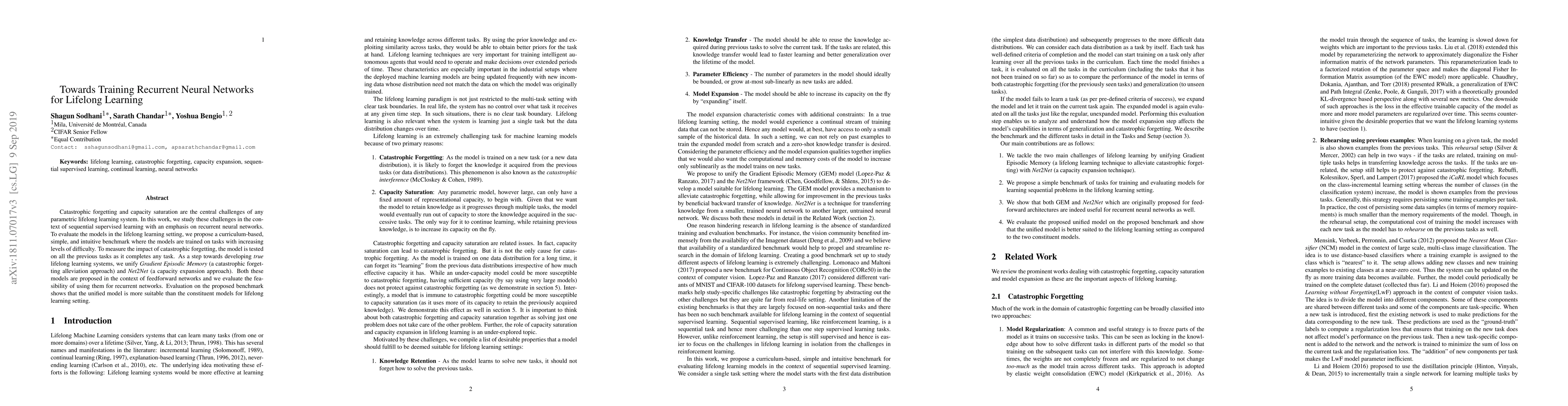 Catastrophic forgetting and capacity saturation are the central challenges of any parametric lifelong learning system. In this work, we study these challenges in the context of sequential supervised learning with an emphasis on recurrent neural networks. To evaluate the models in the lifelong learning setting, we propose a curriculum-based, simple, and intuitive benchmark where the models are trained on tasks with increasing levels of difficulty. To measure the impact of catastrophic forgetting, the model is tested on all the previous tasks as it completes any task. As a step towards developing true lifelong learning systems, we unify Gradient Episodic Memory (a catastrophic forgetting alleviation approach) and Net2Net(a capacity expansion approach). Both these models are proposed in the context of feedforward networks and we evaluate the feasibility of using them for recurrent networks. Evaluation on the proposed benchmark shows that the unified model is more suitable than the constituent models for lifelong learning setting.