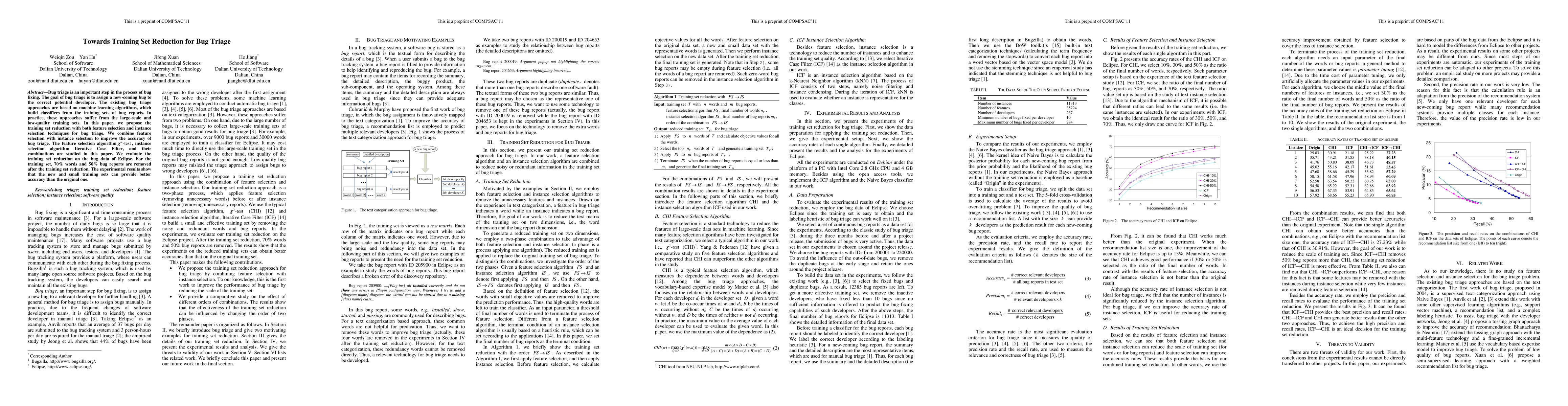 This paper proposes a method for reducing training sets in bug triage using feature and instance selection techniques, achieving higher accuracy with fewer data. Experiments on Eclipse bug data show that the reduced training set maintains or improves accuracy compared to the original large set.