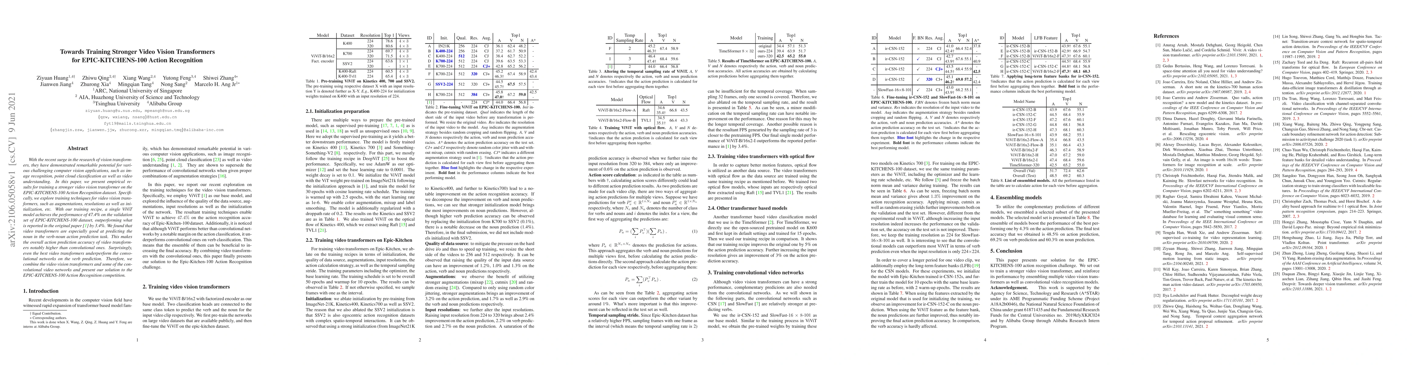 With the recent surge in the research of vision transformers, they have demonstrated remarkable potential for various challenging computer vision applications, such as image recognition, point cloud classification as well as video understanding. In this paper, we present empirical results for training a stronger video vision transformer on the EPIC-KITCHENS-100 Action Recognition dataset. Specifically, we explore training techniques for video vision transformers, such as augmentations, resolutions as well as initialization, etc. With our training recipe, a single ViViT model achieves the performance of 47.4\% on the validation set of EPIC-KITCHENS-100 dataset, outperforming what is reported in the original paper by 3.4%. We found that video transformers are especially good at predicting the noun in the verb-noun action prediction task. This makes the overall action prediction accuracy of video transformers notably higher than convolutional ones. Surprisingly, even the best video transformers underperform the convolutional networks on the verb prediction. Therefore, we combine the video vision transformers and some of the convolutional video networks and present our solution to the EPIC-KITCHENS-100 Action Recognition competition.