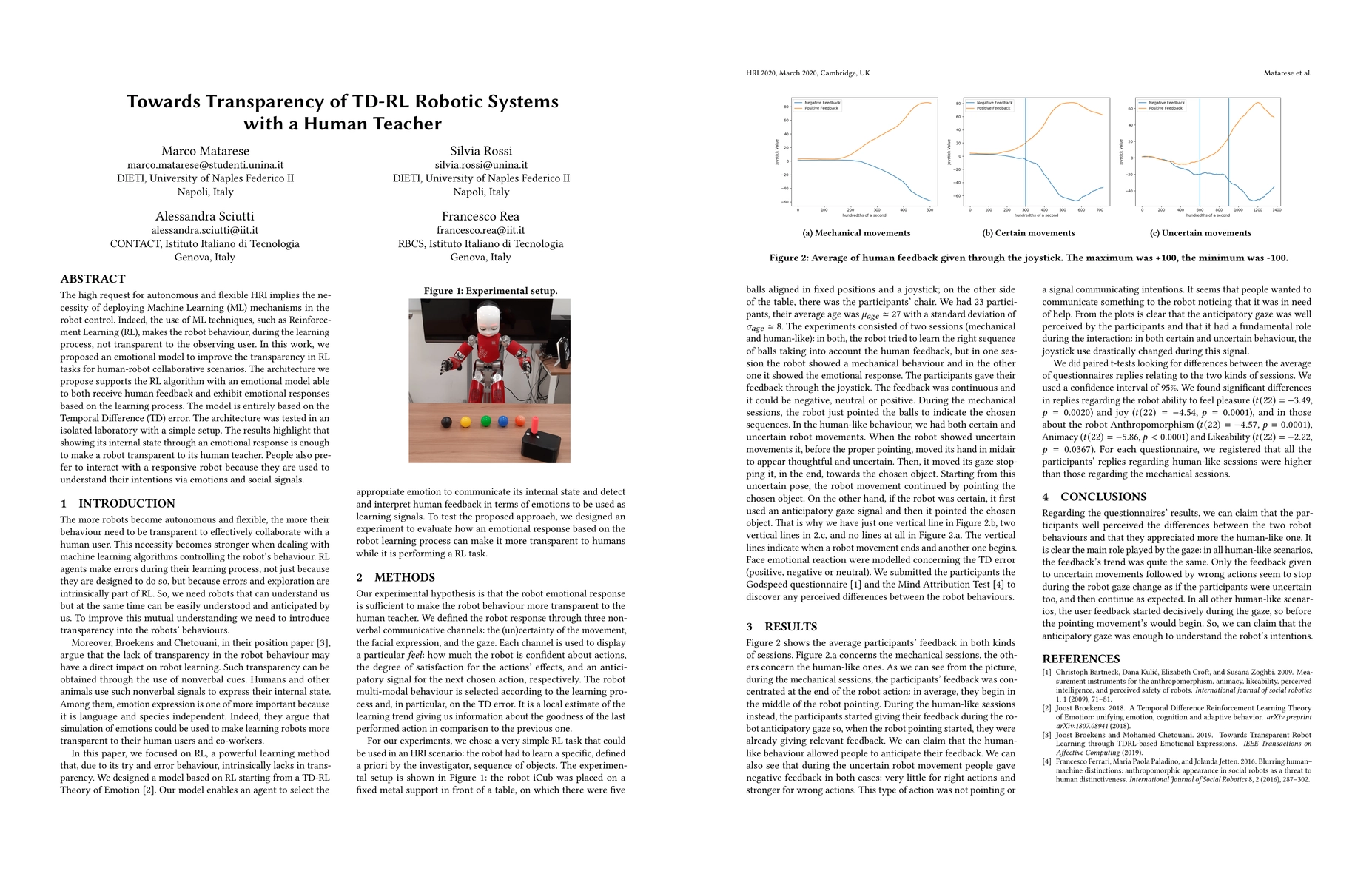 The high request for autonomous and flexible HRI implies the necessity of deploying Machine Learning (ML) mechanisms in the robot control. Indeed, the use of ML techniques, such as Reinforcement Learning (RL), makes the robot behaviour, during the learning process, not transparent to the observing user. In this work, we proposed an emotional model to improve the transparency in RL tasks for human-robot collaborative scenarios. The architecture we propose supports the RL algorithm with an emotional model able to both receive human feedback and exhibit emotional responses based on the learning process. The model is entirely based on the Temporal Difference (TD) error. The architecture was tested in an isolated laboratory with a simple setup. The results highlight that showing its internal state through an emotional response is enough to make a robot transparent to its human teacher. People also prefer to interact with a responsive robot because they are used to understand their intentions via emotions and social signals.