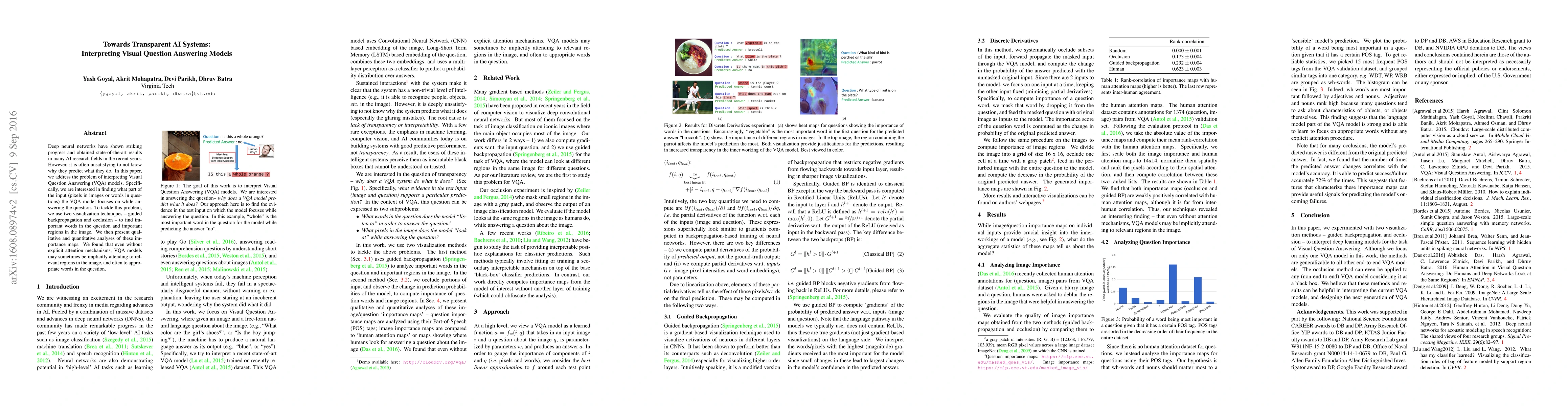 This paper explores the interpretation of Visual Question Answering (VQA) models, aiming to identify which parts of images or questions the models focus on. Using guided backpropagation and occlusion techniques, the researchers found that VQA models can implicitly attend to relevant image regions and appropriate question words, even without explicit attention mechanisms. The study provides both qualitative and quantitative analyses of these importance maps.
