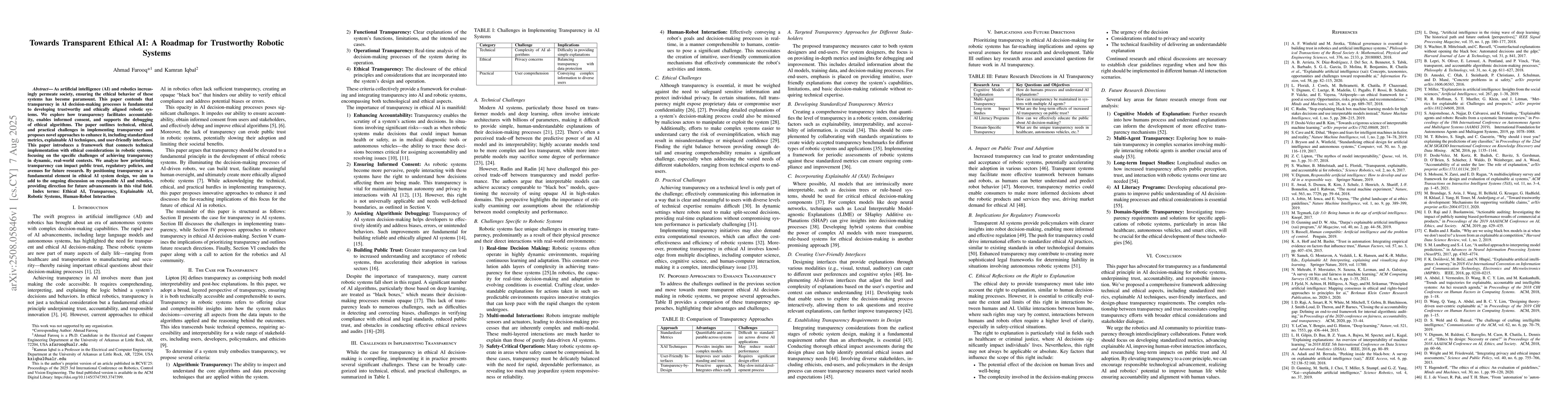 As artificial intelligence (AI) and robotics increasingly permeate society, ensuring the ethical behavior of these systems has become paramount. This paper contends that transparency in AI decision-making processes is fundamental to developing trustworthy and ethically aligned robotic systems. We explore how transparency facilitates accountability, enables informed consent, and supports the debugging of ethical algorithms. The paper outlines technical, ethical, and practical challenges in implementing transparency and proposes novel approaches to enhance it, including standardized metrics, explainable AI techniques, and user-friendly interfaces. This paper introduces a framework that connects technical implementation with ethical considerations in robotic systems, focusing on the specific challenges of achieving transparency in dynamic, real-world contexts. We analyze how prioritizing transparency can impact public trust, regulatory policies, and avenues for future research. By positioning transparency as a fundamental element in ethical AI system design, we aim to add to the ongoing discussion on responsible AI and robotics, providing direction for future advancements in this vital field.