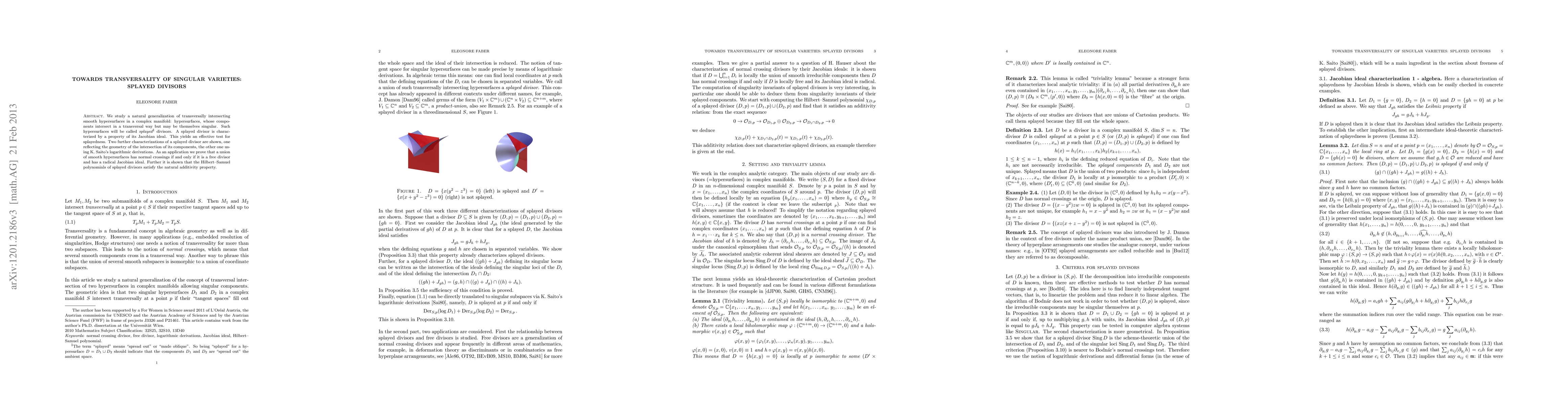 We study a natural generalization of transversally intersecting smooth hypersurfaces in a complex manifold: hypersurfaces, whose components intersect in a transversal way but may be themselves singular. Such hypersurfaces will be called splayed divisors. A splayed divisor is characterized by a property of its Jacobian ideal. This yields an effective test for splayedness. Two further characterizations of a splayed divisor are shown, one reflecting the geometry of the intersection of its components, the other one using K. Saito's logarithmic derivations. As an application we prove that a union of smooth hypersurfaces has normal crossings if and only if it is a free divisor and has a radical Jacobian ideal. Further it is shown that the Hilbert-Samuel polynomials of splayed divisors satisfy a certain additivity property.