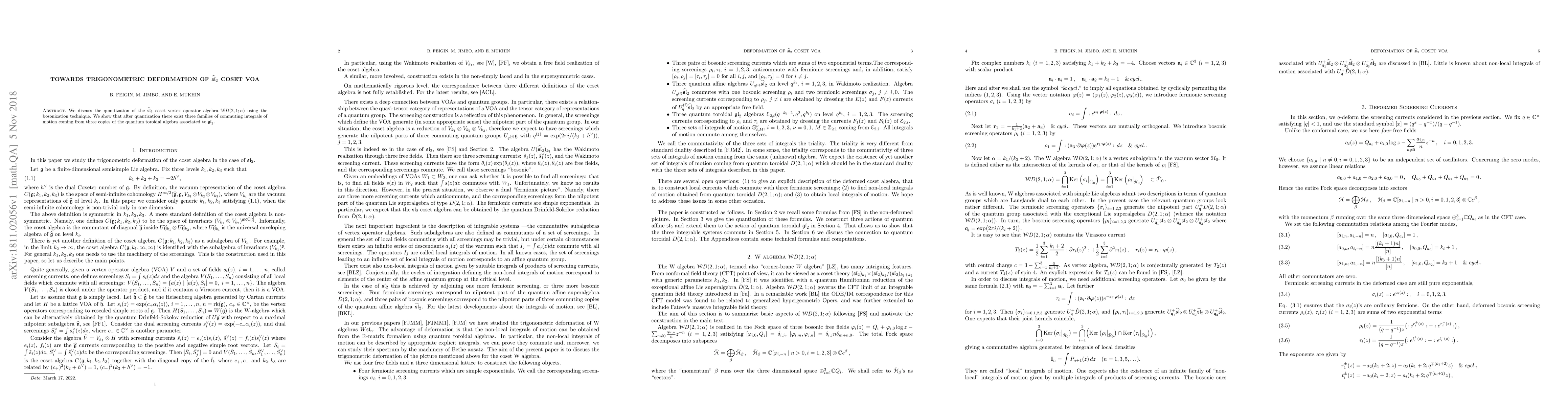 We discuss the quantization of the $\widehat{\mathfrak{sl}}_2$ coset vertex operator algebra $\mathcal{W}D(2,1;\alpha)$ using the bosonization technique. We show that after quantization there exist three families of commuting integrals of motion coming from three copies of the quantum toroidal algebra associated to ${\mathfrak{gl}}_2$.