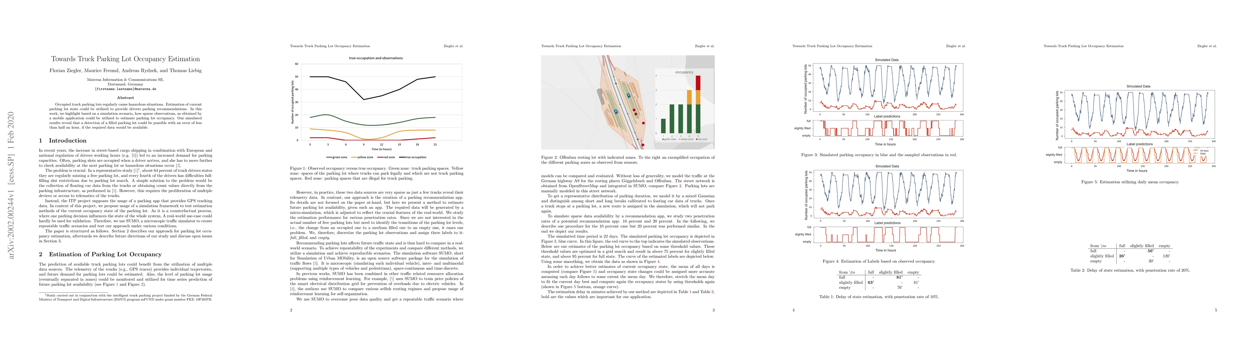 Occupied truck parking lots regularly cause hazardous situations. Estimation of current parking lot state could be utilized to provide drivers parking recommendations. In this work, we highlight based on a simulation scenario, how sparse observations, as obtained by a mobile application could be utilized to estimate parking lot occupancy. Our simulated results reveal that a detection of a filled parking lot could be possible with an error of less than half an hour, if the required data would be available.