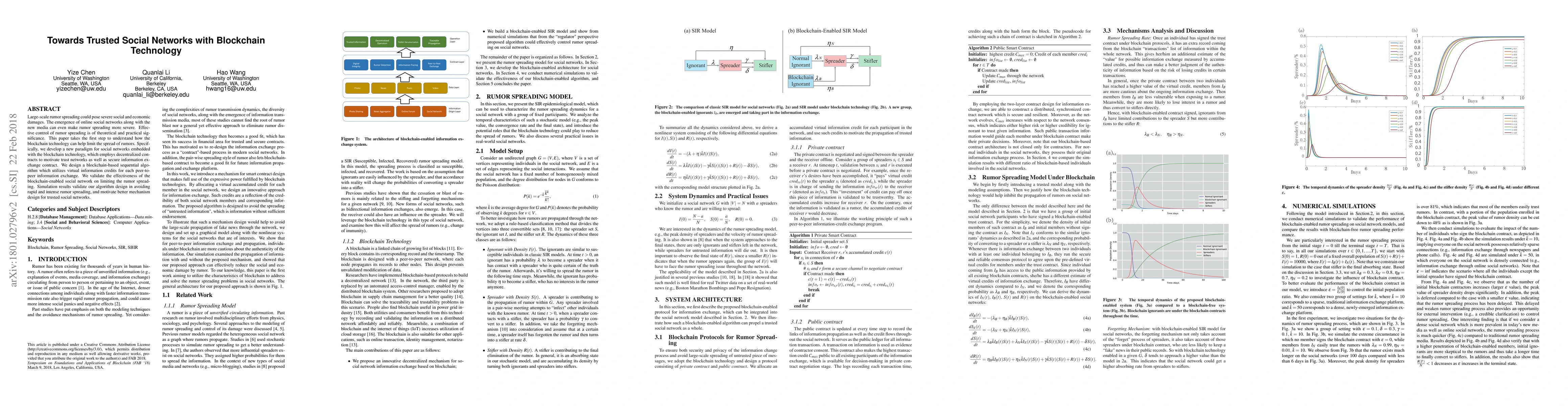 This paper explores how blockchain technology can mitigate rumor spreading in social networks by embedding decentralized contracts and a sequential algorithm using virtual information credits. Simulation results show that the proposed blockchain-enabled social network effectively limits rapid and intense rumor propagation.