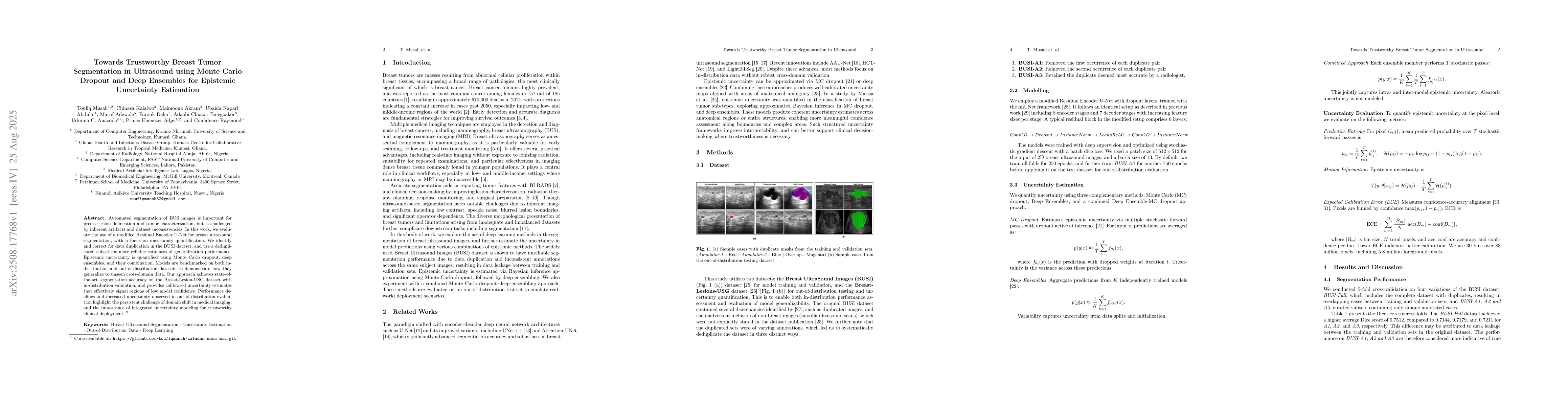Automated segmentation of BUS images is important for precise lesion delineation and tumor characterization, but is challenged by inherent artifacts and dataset inconsistencies. In this work, we evaluate the use of a modified Residual Encoder U-Net for breast ultrasound segmentation, with a focus on uncertainty quantification. We identify and correct for data duplication in the BUSI dataset, and use a deduplicated subset for more reliable estimates of generalization performance. Epistemic uncertainty is quantified using Monte Carlo dropout, deep ensembles, and their combination. Models are benchmarked on both in-distribution and out-of-distribution datasets to demonstrate how they generalize to unseen cross-domain data. Our approach achieves state-of-the-art segmentation accuracy on the Breast-Lesion-USG dataset with in-distribution validation, and provides calibrated uncertainty estimates that effectively signal regions of low model confidence. Performance declines and increased uncertainty observed in out-of-distribution evaluation highlight the persistent challenge of domain shift in medical imaging, and the importance of integrated uncertainty modeling for trustworthy clinical deployment. \footnote{Code available at: https://github.com/toufiqmusah/nn-uncertainty.git}