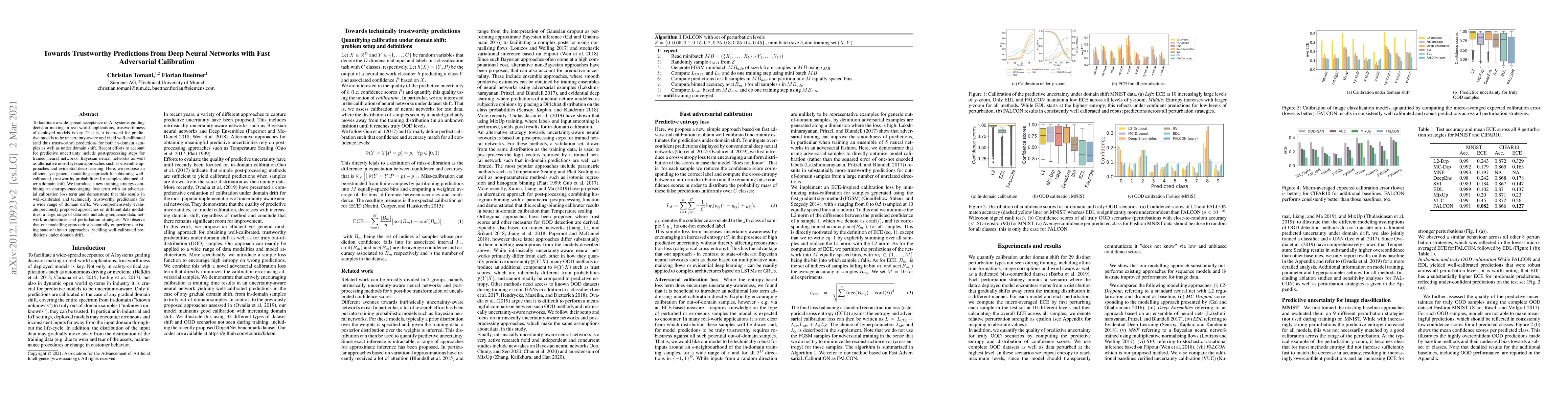 To facilitate a wide-spread acceptance of AI systems guiding decision making in real-world applications, trustworthiness of deployed models is key. That is, it is crucial for predictive models to be uncertainty-aware and yield well-calibrated (and thus trustworthy) predictions for both in-domain samples as well as under domain shift. Recent efforts to account for predictive uncertainty include post-processing steps for trained neural networks, Bayesian neural networks as well as alternative non-Bayesian approaches such as ensemble approaches and evidential deep learning. Here, we propose an efficient yet general modelling approach for obtaining well-calibrated, trustworthy probabilities for samples obtained after a domain shift. We introduce a new training strategy combining an entropy-encouraging loss term with an adversarial calibration loss term and demonstrate that this results in well-calibrated and technically trustworthy predictions for a wide range of domain drifts. We comprehensively evaluate previously proposed approaches on different data modalities, a large range of data sets including sequence data, network architectures and perturbation strategies. We observe that our modelling approach substantially outperforms existing state-of-the-art approaches, yielding well-calibrated predictions under domain drift.
