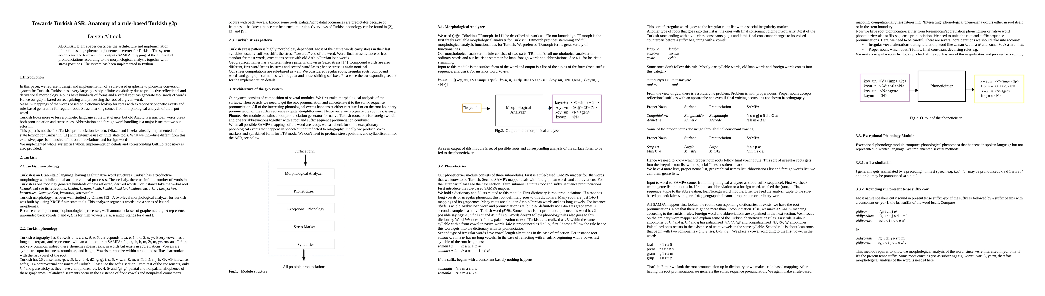 This paper describes the architecture and implementation of a rule-based grapheme to phoneme converter for Turkish. The system accepts surface form as input, outputs SAMPA mapping of the all parallel pronounciations according to the morphological analysis together with stress positions. The system has been implemented in Python