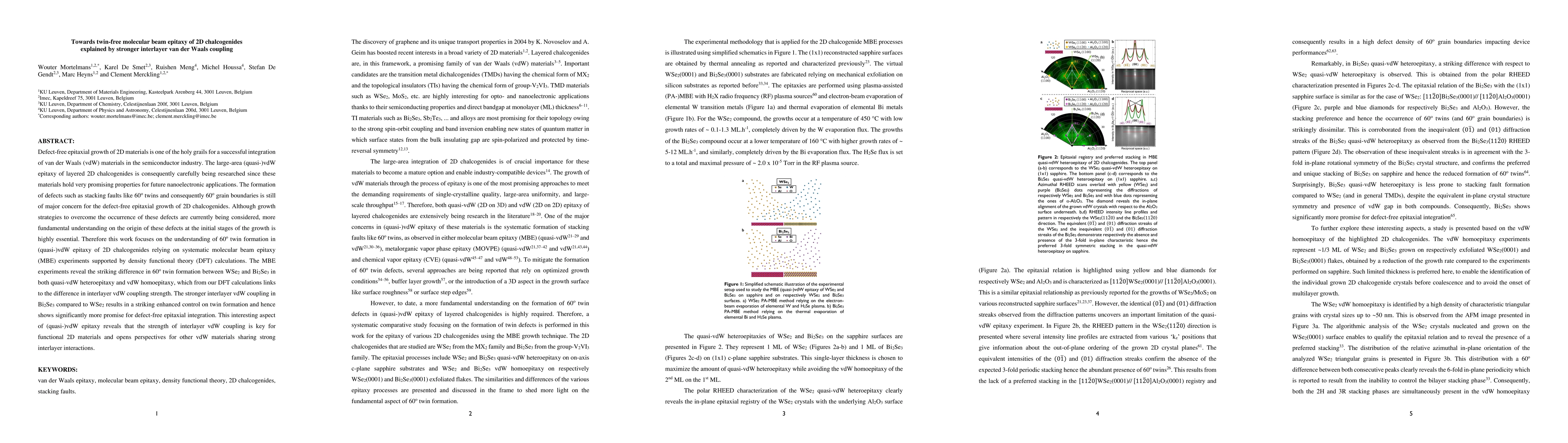 This paper explores the defect-free epitaxial growth of 2D chalcogenides via molecular beam epitaxy, emphasizing the role of interlayer van der Waals coupling in reducing twin defects. The study finds that stronger interlayer vdW coupling in Bi2Se3 compared to WSe2 significantly enhances control over twin formation, suggesting promising prospects for defect-free integration of vdW materials in nanoelectronics.