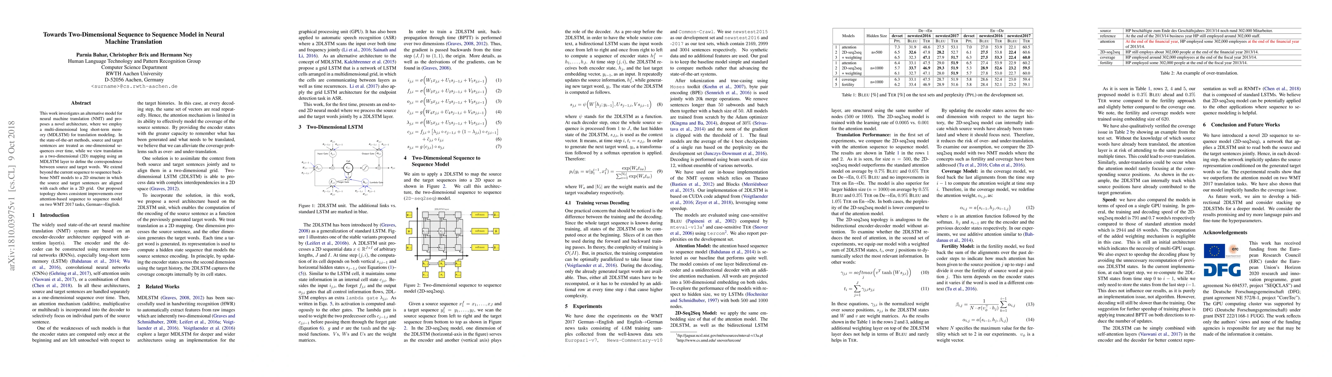This paper proposes a novel two-dimensional sequence to sequence model for neural machine translation using a multi-dimensional LSTM, treating translation as a 2D mapping rather than a 1D sequence. The model shows consistent improvements over traditional sequence to sequence models on WMT 2017 German-English translation tasks.