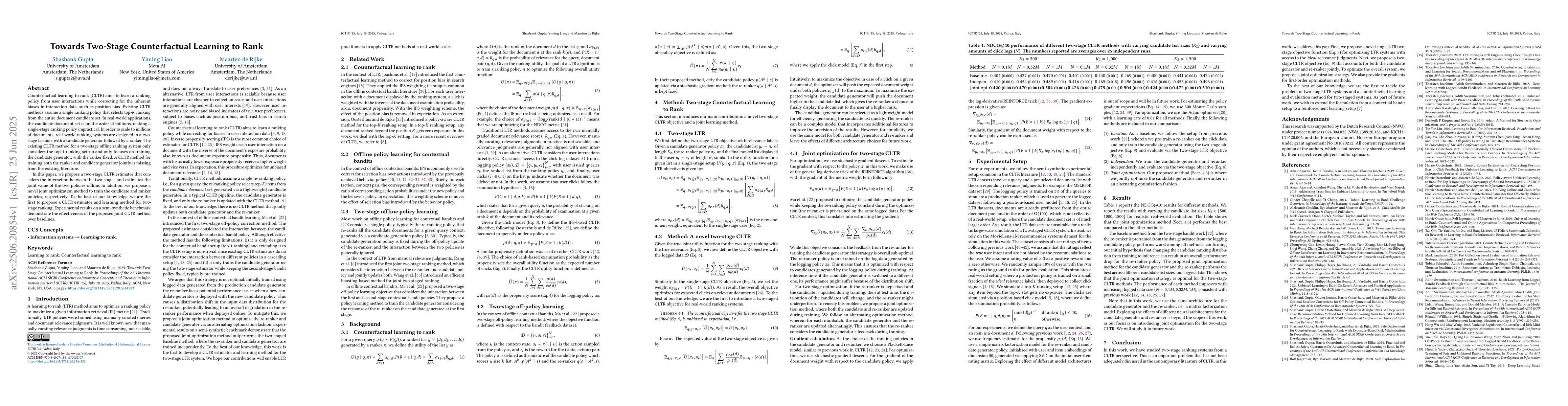 Counterfactual learning to rank (CLTR) aims to learn a ranking policy from user interactions while correcting for the inherent biases in interaction data, such as position bias. Existing CLTR methods assume a single ranking policy that selects top-K ranking from the entire document candidate set. In real-world applications, the candidate document set is on the order of millions, making a single-stage ranking policy impractical. In order to scale to millions of documents, real-world ranking systems are designed in a two-stage fashion, with a candidate generator followed by a ranker. The existing CLTR method for a two-stage offline ranking system only considers the top-1 ranking set-up and only focuses on training the candidate generator, with the ranker fixed. A CLTR method for training both the ranker and candidate generator jointly is missing from the existing literature. In this paper, we propose a two-stage CLTR estimator that considers the interaction between the two stages and estimates the joint value of the two policies offline. In addition, we propose a novel joint optimization method to train the candidate and ranker policies, respectively. To the best of our knowledge, we are the first to propose a CLTR estimator and learning method for two-stage ranking. Experimental results on a semi-synthetic benchmark demonstrate the effectiveness of the proposed joint CLTR method over baselines.