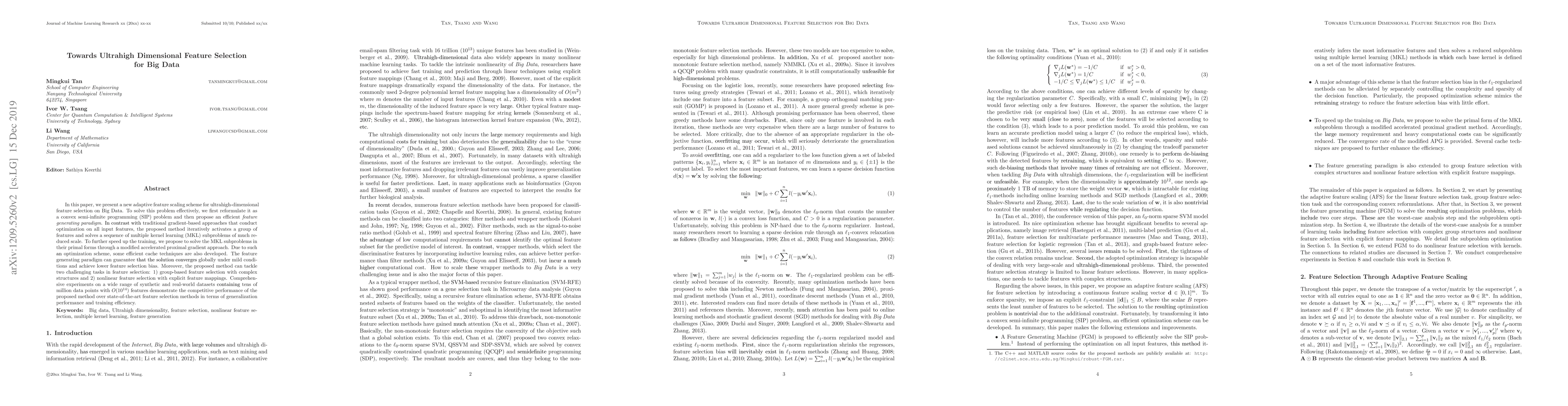 This paper introduces an adaptive feature scaling scheme for ultrahigh-dimensional feature selection in Big Data, reformulating the problem as a convex semi-infinite programming problem and employing an efficient feature generating paradigm. The method iteratively activates feature groups and solves reduced-scale multiple kernel learning subproblems, achieving competitive performance and training efficiency.