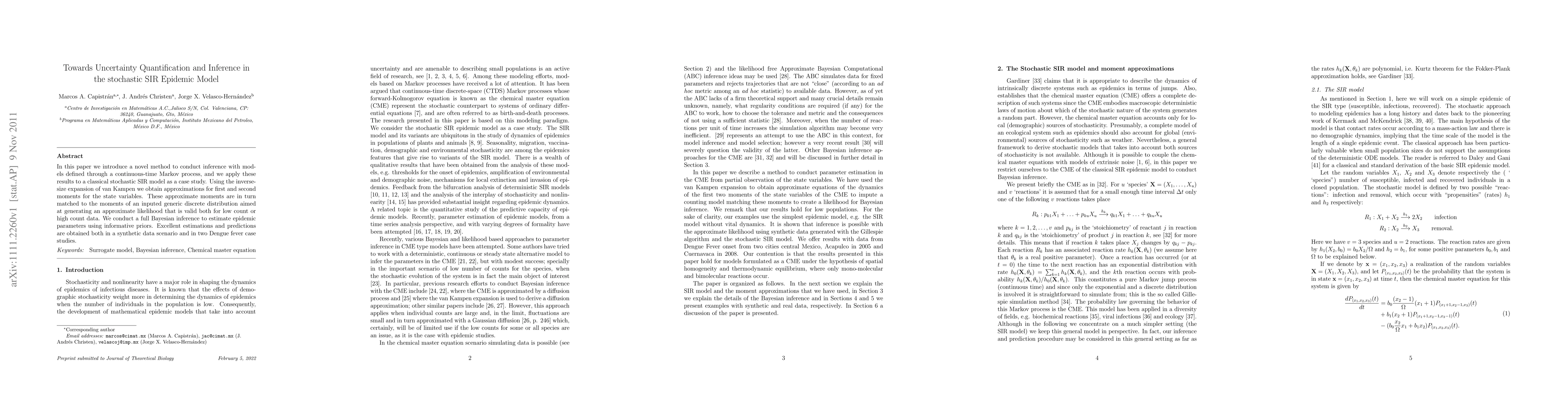 In this paper we introduce a novel method to conduct inference with models defined through a continuous-time Markov process, and we apply these results to a classical stochastic SIR model as a case study. Using the inverse-size expansion of van Kampen we obtain approximations for first and second moments for the state variables. These approximate moments are in turn matched to the moments of an inputed generic discrete distribution aimed at generating an approximate likelihood that is valid both for low count or high count data. We conduct a full Bayesian inference to estimate epidemic parameters using informative priors. Excellent estimations and predictions are obtained both in a synthetic data scenario and in two Dengue fever case studies.