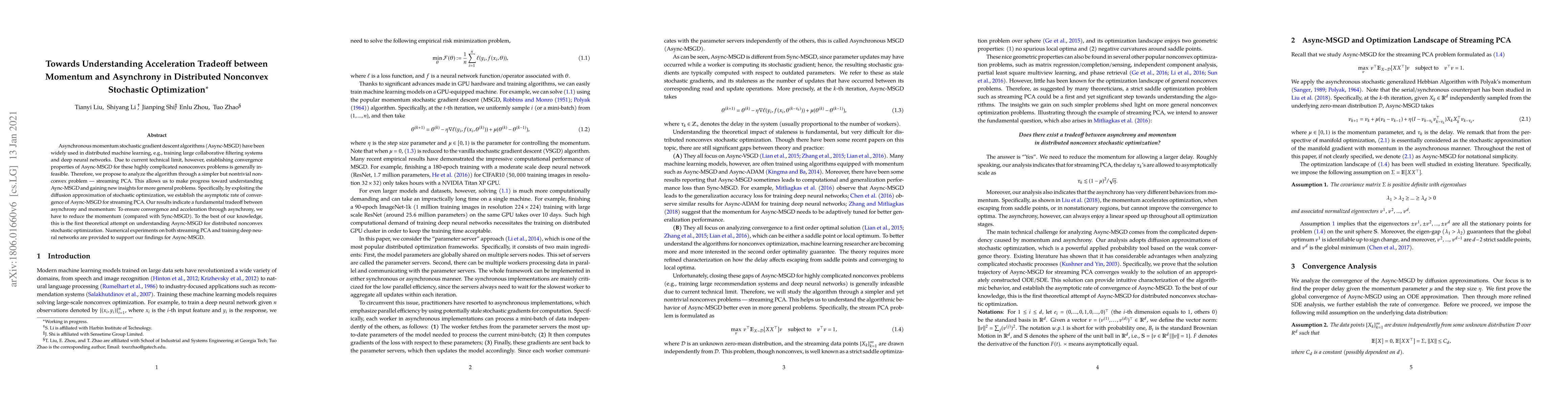Asynchronous momentum stochastic gradient descent algorithms (Async-MSGD) is one of the most popular algorithms in distributed machine learning. However, its convergence properties for these complicated nonconvex problems is still largely unknown, because of the current technical limit. Therefore, in this paper, we propose to analyze the algorithm through a simpler but nontrivial nonconvex problem - streaming PCA, which helps us to understand Aync-MSGD better even for more general problems. Specifically, we establish the asymptotic rate of convergence of Async-MSGD for streaming PCA by diffusion approximation. Our results indicate a fundamental tradeoff between asynchrony and momentum: To ensure convergence and acceleration through asynchrony, we have to reduce the momentum (compared with Sync-MSGD). To the best of our knowledge, this is the first theoretical attempt on understanding Async-MSGD for distributed nonconvex stochastic optimization. Numerical experiments on both streaming PCA and training deep neural networks are provided to support our findings for Async-MSGD.