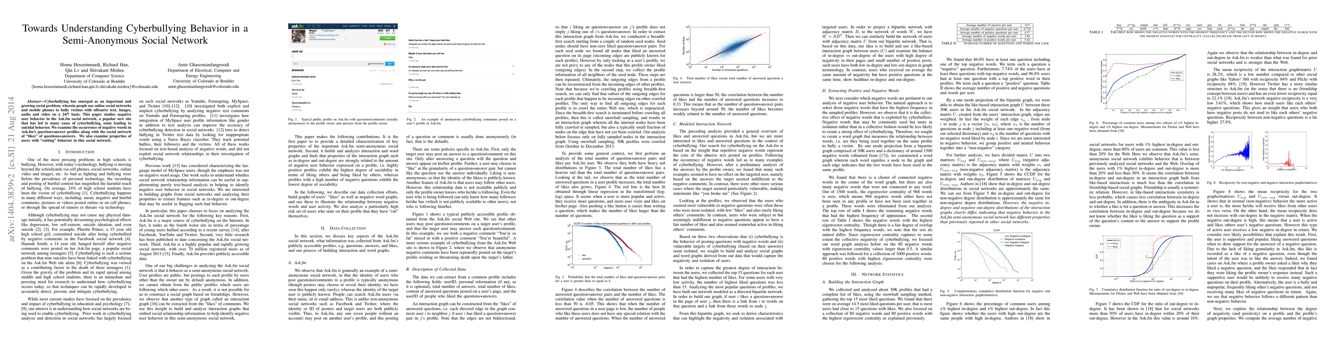 Cyberbullying has emerged as an important and growing social problem, wherein people use online social networks and mobile phones to bully victims with offensive text, images, audio and video on a 247 basis. This paper studies negative user behavior in the Ask.fm social network, a popular new site that has led to many cases of cyberbullying, some leading to suicidal behavior.We examine the occurrence of negative words in Ask.fms question+answer profiles along with the social network of likes of questions+answers. We also examine properties of users with cutting behavior in this social network.