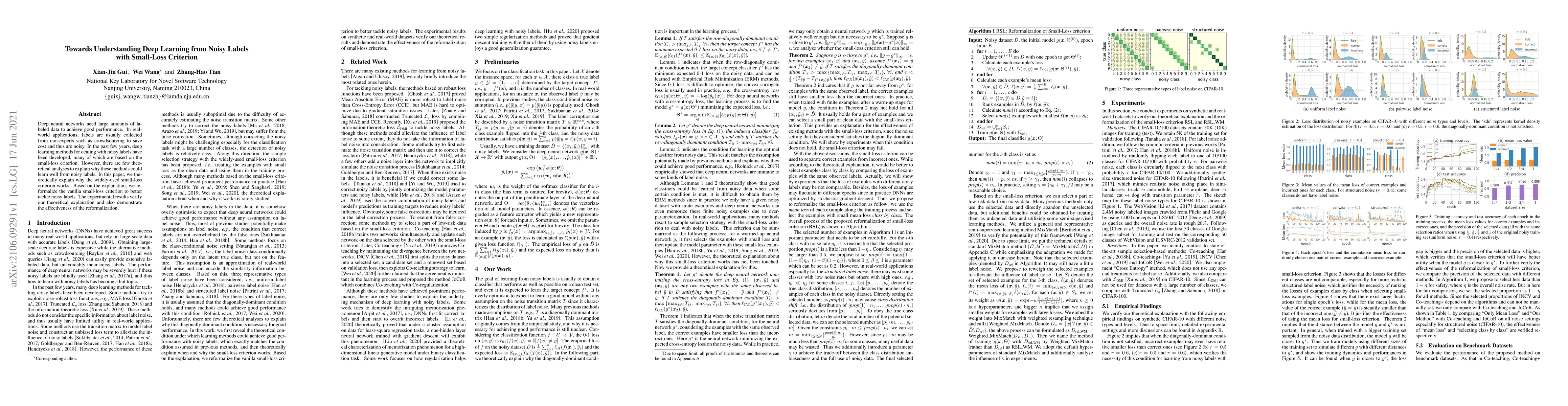 This paper theoretically explains the effectiveness of the small-loss criterion in deep learning with noisy labels, providing insights into why it works. The authors reformulate the small-loss criterion to better handle noisy labels, and experimental results confirm the theoretical explanation and the improved performance.