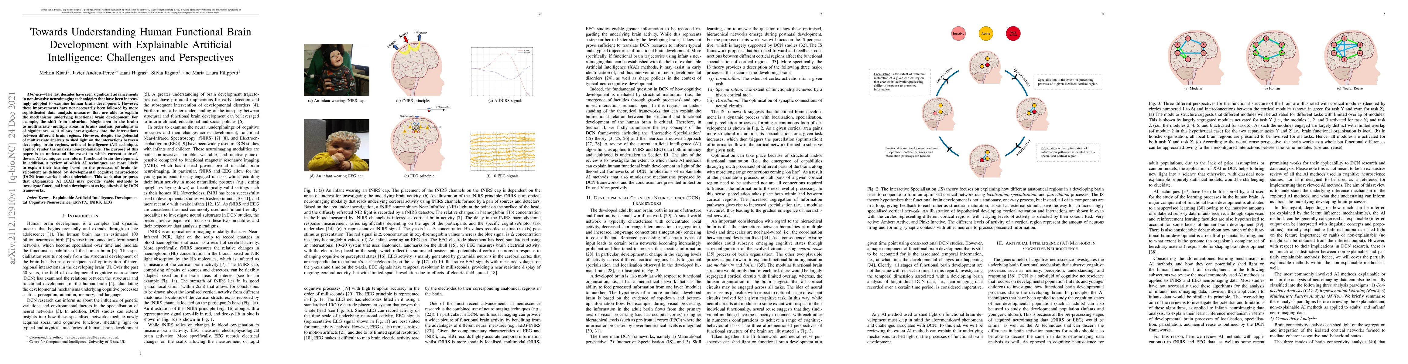 The last decades have seen significant advancements in non-invasive neuroimaging technologies that have been increasingly adopted to examine human brain development. However, these improvements have not necessarily been followed by more sophisticated data analysis measures that are able to explain the mechanisms underlying functional brain development. For example, the shift from univariate (single area in the brain) to multivariate (multiple areas in brain) analysis paradigms is of significance as it allows investigations into the interactions between different brain regions. However, despite the potential of multivariate analysis to shed light on the interactions between developing brain regions, artificial intelligence (AI) techniques applied render the analysis non-explainable. The purpose of this paper is to understand the extent to which current state-of-the-art AI techniques can inform functional brain development. In addition, a review of which AI techniques are more likely to explain their learning based on the processes of brain development as defined by developmental cognitive neuroscience (DCN) frameworks is also undertaken. This work also proposes that eXplainable AI (XAI) may provide viable methods to investigate functional brain development as hypothesised by DCN frameworks.