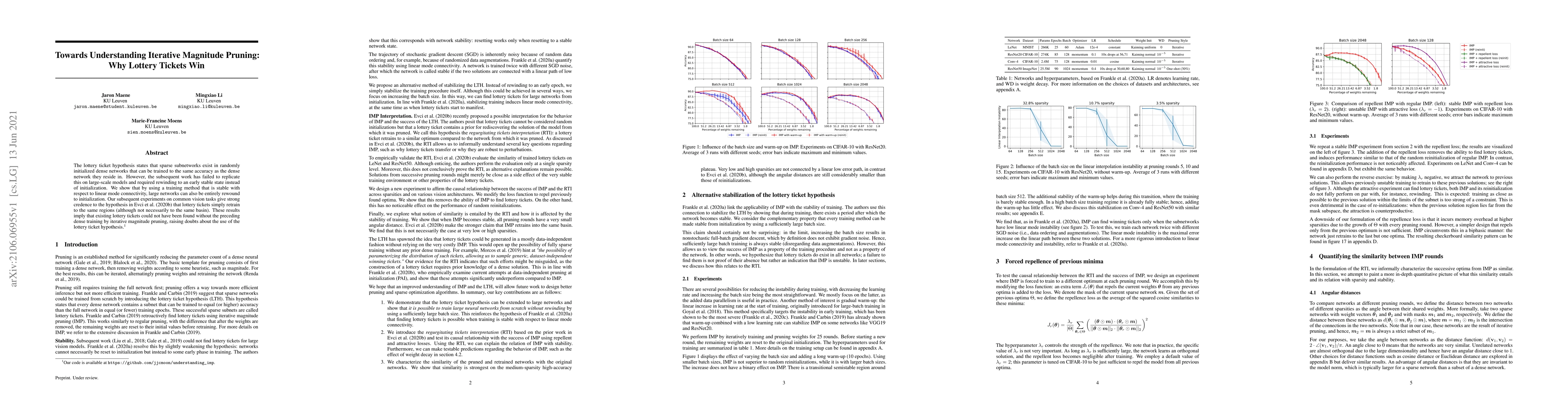 The paper investigates the lottery ticket hypothesis by analyzing iterative magnitude pruning (IMP) on large-scale models, demonstrating that stable training with linear mode connectivity allows rewinding to initialization, and experiments on common vision tasks support the idea that lottery tickets retrain to similar regions rather than exact basins.