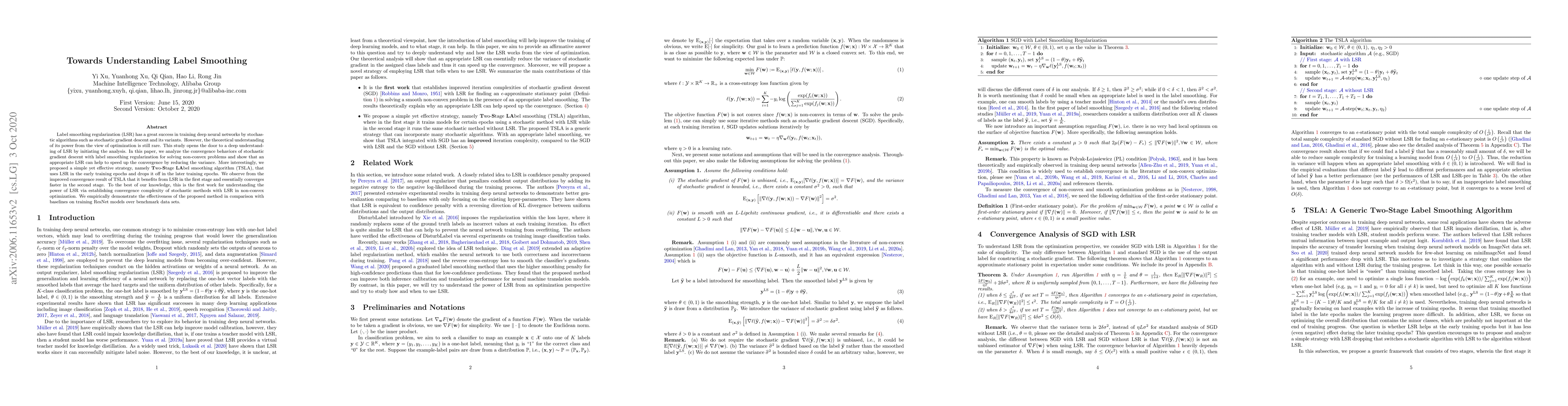 This paper explores the theoretical underpinnings of label smoothing regularization (LSR) in deep neural networks, demonstrating its role in accelerating convergence by reducing variance. It introduces the Two-Stage LAbel smoothing algorithm (TSLA) that applies LSR early in training and drops it later, showing improved convergence and effectiveness on ResNet models.
