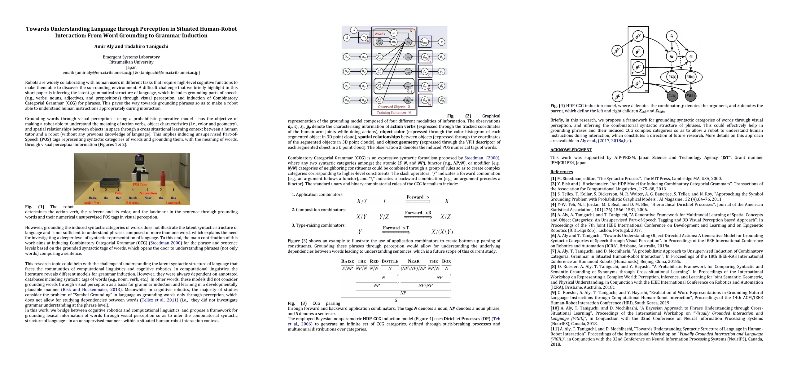 Robots are widely collaborating with human users in diferent tasks that require high-level cognitive functions to make them able to discover the surrounding environment. A difcult challenge that we briefy highlight in this short paper is inferring the latent grammatical structure of language, which includes grounding parts of speech (e.g., verbs, nouns, adjectives, and prepositions) through visual perception, and induction of Combinatory Categorial Grammar (CCG) for phrases. This paves the way towards grounding phrases so as to make a robot able to understand human instructions appropriately during interaction.