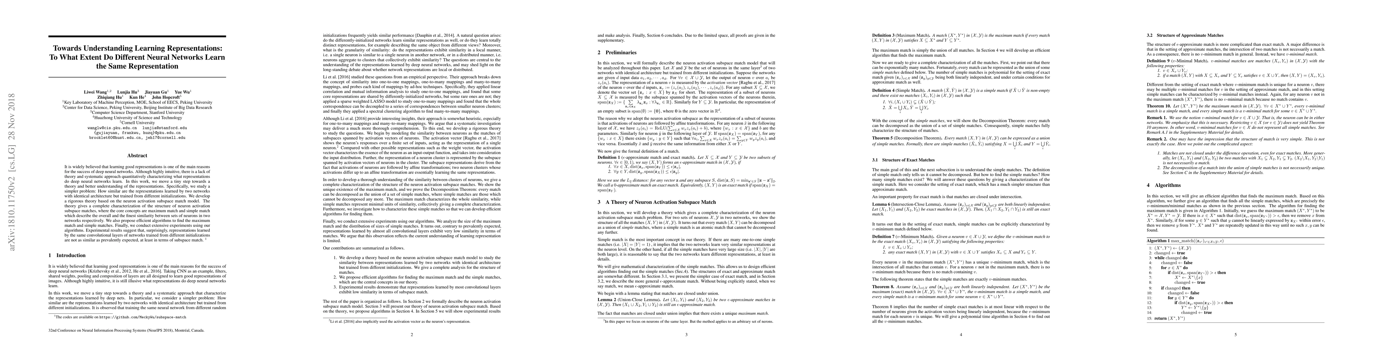 It is widely believed that learning good representations is one of the main reasons for the success of deep neural networks. Although highly intuitive, there is a lack of theory and systematic approach quantitatively characterizing what representations do deep neural networks learn. In this work, we move a tiny step towards a theory and better understanding of the representations. Specifically, we study a simpler problem: How similar are the representations learned by two networks with identical architecture but trained from different initializations. We develop a rigorous theory based on the neuron activation subspace match model. The theory gives a complete characterization of the structure of neuron activation subspace matches, where the core concepts are maximum match and simple match which describe the overall and the finest similarity between sets of neurons in two networks respectively. We also propose efficient algorithms to find the maximum match and simple matches. Finally, we conduct extensive experiments using our algorithms. Experimental results suggest that, surprisingly, representations learned by the same convolutional layers of networks trained from different initializations are not as similar as prevalently expected, at least in terms of subspace match.