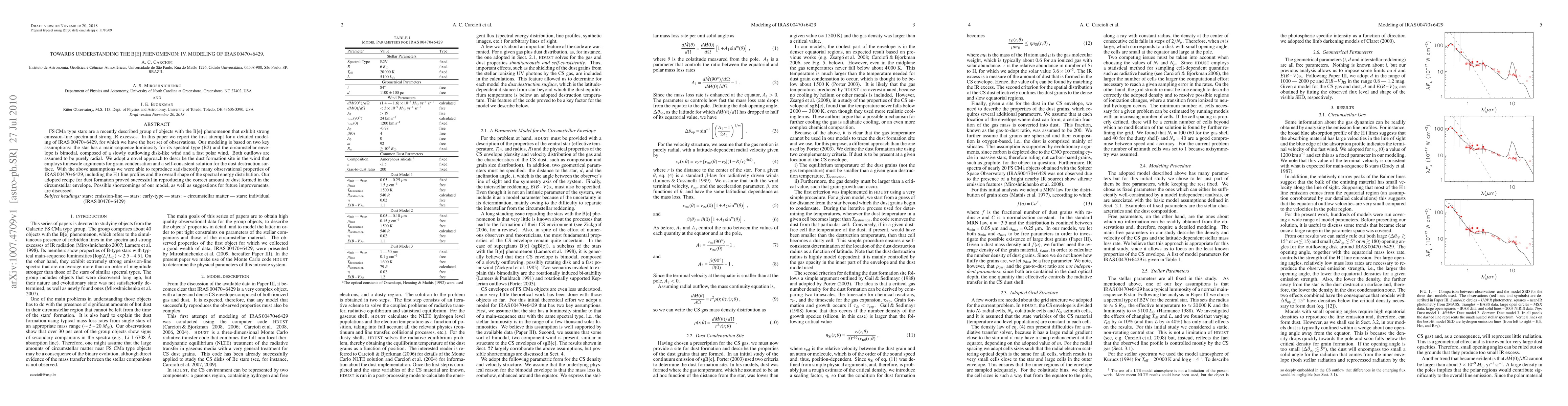 FS CMa type stars are a recently described group of objects with the B[e] phenomenon that exhibit strong emission-line spectra and strong IR excesses. In this paper we report the first attempt for a detailed modeling of IRAS 00470+6429, for which we have the best set of observations. Our modeling is based on two key assumptions: the star has a main-sequence luminosity for its spectral type (B2) and the circumstellar envelope is bimodal, composed of a slowly outflowing disk-like wind and a fast polar wind. Both outflows are assumed to be purely radial. We adopt a novel approach to describe the dust formation site in the wind that employs timescale arguments for grain condensation and a self-consistent solution for the dust destruction surface. With the above assumptions we were able to reproduce satisfactorily many observational properties of IRAS 00470+6429, including the H line profiles and the overall shape of the spectral energy distribution. Our adopted recipe for dust formation proved successful in reproducing the correct amount of dust formed in the circumstellar envelope. Possible shortcomings of our model, as well as suggestions for future improvements, are discussed.