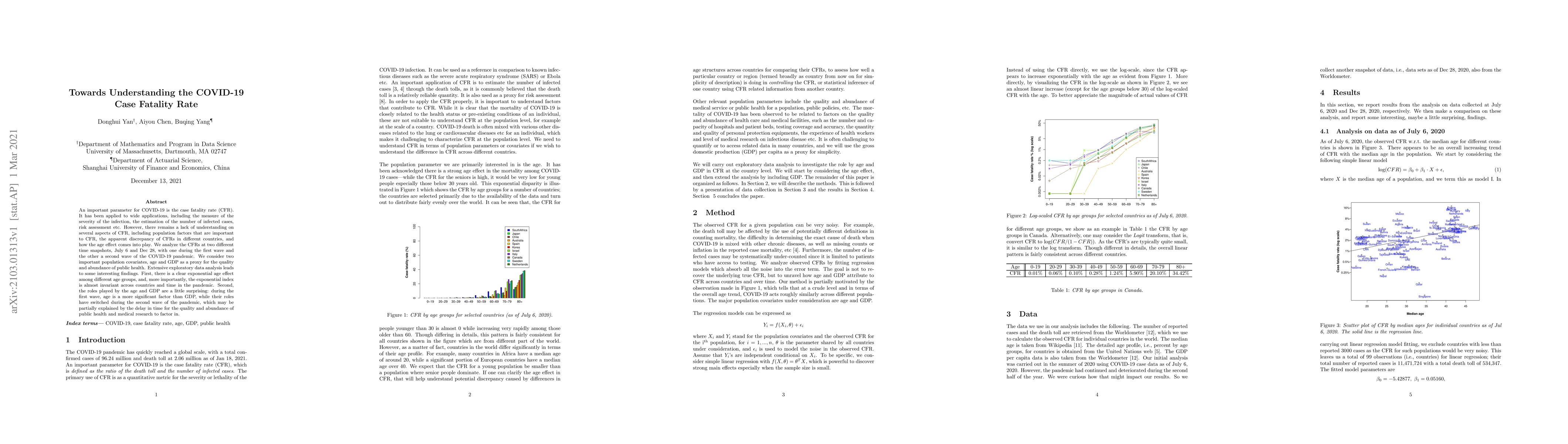 An important parameter for COVID-19 is the case fatality rate (CFR). It has been applied to wide applications, including the measure of the severity of the infection, the estimation of the number of infected cases, risk assessment etc. However, there remains a lack of understanding on several aspects of CFR, including population factors that are important to CFR, the apparent discrepancy of CFRs in different countries, and how the age effect comes into play. We analyze the CFRs at two different time snapshots, July 6 and Dec 28, 2020, with one during the first wave and the other a second wave of the COVID-19 pandemic. We consider two important population covariates, age and GDP as a proxy for the quality and abundance of public health. Extensive exploratory data analysis leads to some interesting findings. First, there is a clear exponential age effect among different age groups, and, more importantly, the exponential index is almost invariant across countries and time in the pandemic. Second, the roles played by the age and GDP are a little surprising: during the first wave, age is a more significant factor than GDP, while their roles have switched during the second wave of the pandemic, which may be partially explained by the delay in time for the quality and abundance of public health and medical research to factor in.