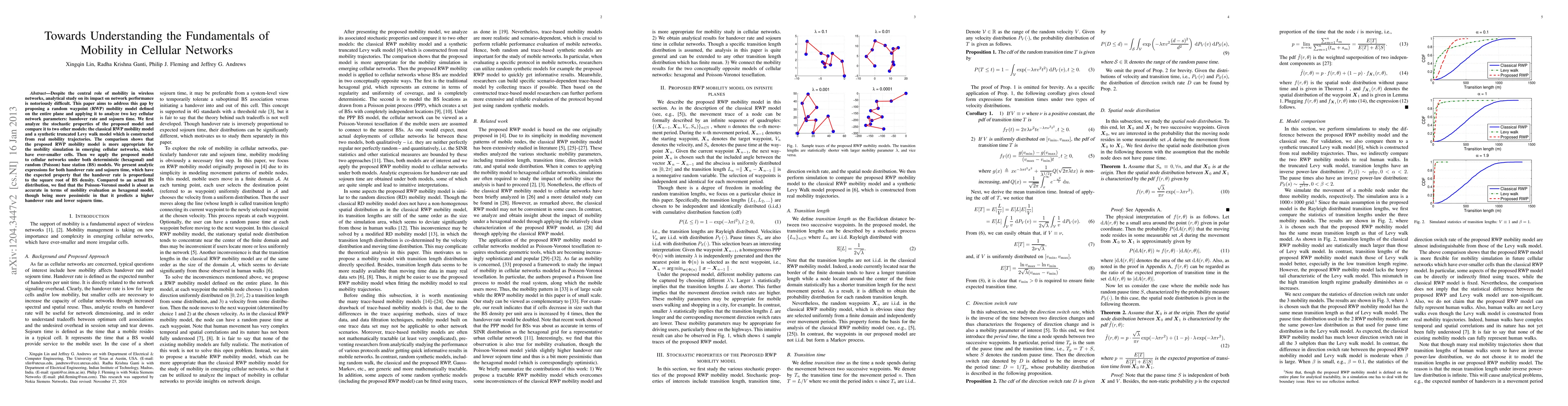 This paper proposes a random waypoint mobility model to analyze handover rate and sojourn time in cellular networks, comparing it to classical RWP and a synthetic truncated Levy walk model. The proposed model is shown to be more suitable for emerging cellular networks with smaller cells, and it reveals that the Poisson-Voronoi model is nearly as accurate as the hexagonal model in predicting mobility-related metrics.