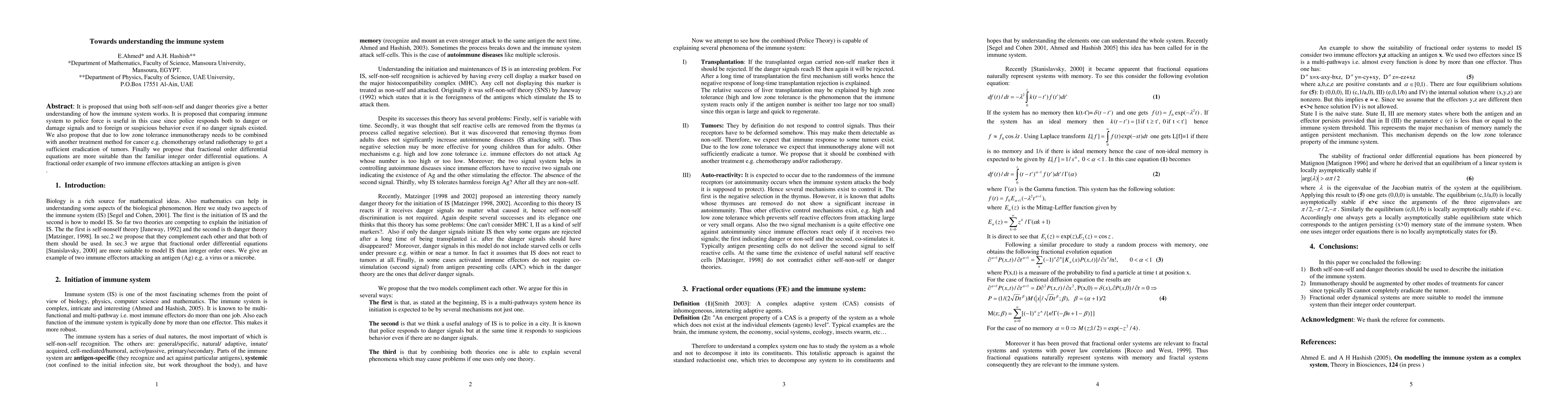 It is proposed that using both self-non-self and danger theories give a better understanding of how the immune system works. It is proposed that comparing immune system to police force is useful in this case since police responds both to danger or damage signals and to foreign or suspicious behavior even if no danger signals existed. We also propose that due to low zone tolerance immunotherapy needs to be combined with another treatment method for cancer e.g. chemotherapy or/and radiotherapy to get a sufficient eradication of tumors. Finally we propose that fractional order differential equations are more suitable than the familiar integer order differential equations. A fractional order example of two immune effectors attacking an antigen is given.