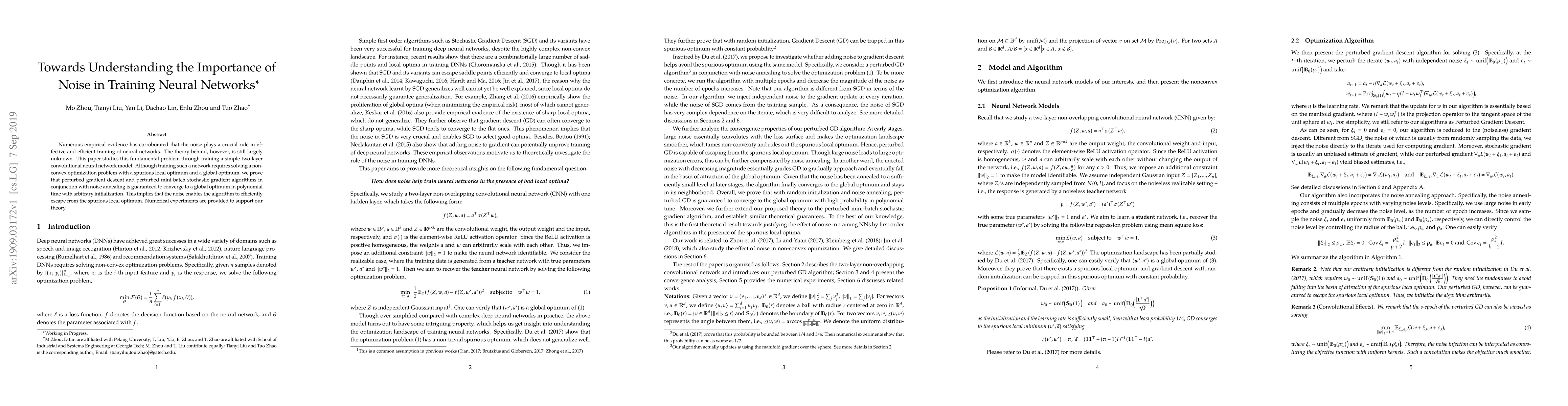 This paper investigates the role of noise in training neural networks, demonstrating that noise aids gradient descent algorithms in escaping local optima and converging to global optima. Theoretical proofs and numerical experiments confirm that noise annealing enhances training efficiency and effectiveness.