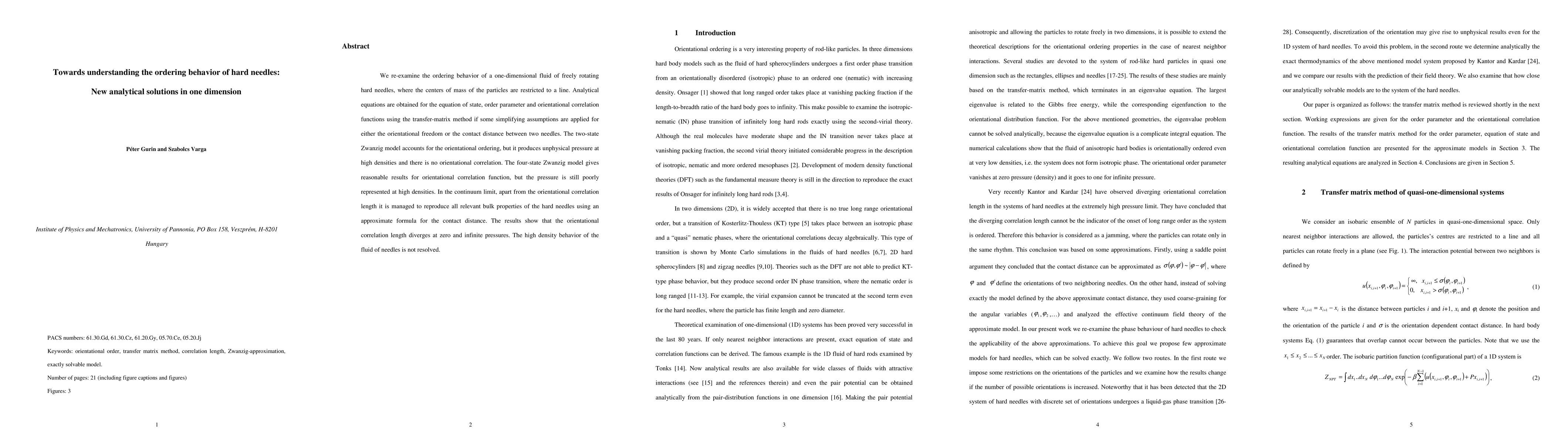 This paper presents analytical solutions for the ordering behavior of one-dimensional hard needles using the transfer-matrix method, revealing issues with existing Zwanzig models at high densities. It manages to reproduce bulk properties but fails to resolve the high-density behavior, showing divergent orientational correlation length at extreme pressures.