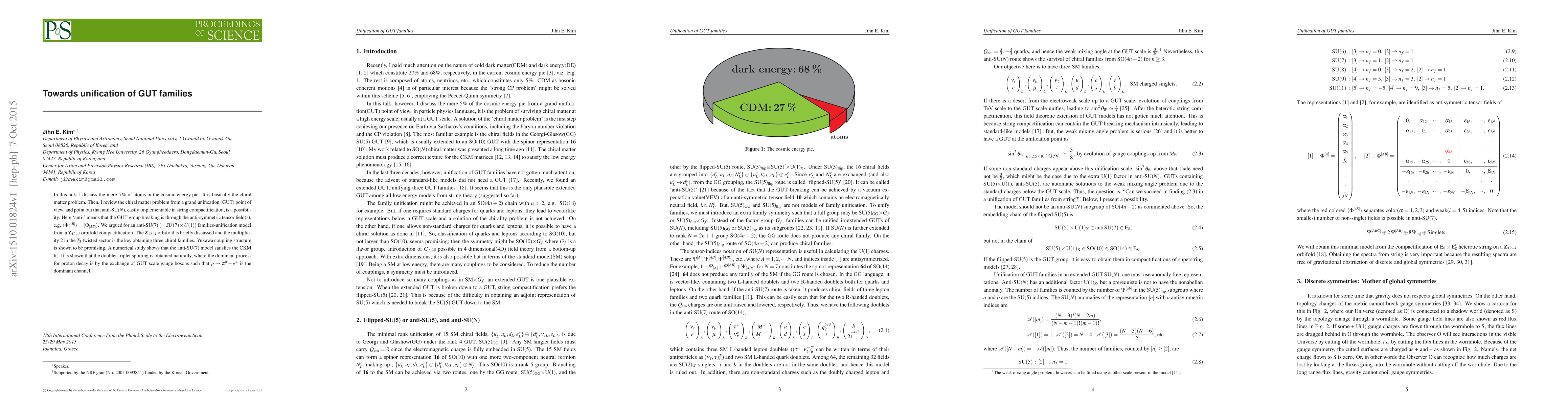 I discuss the mere 5 % of atoms in the cosmic energy pie. It is basically the chiral matter problem. Then, I review the chiral matter problem from a grand unification (GUT) point of view, and point out that anti-SU(N), easily implementable in string compactification, is a possibility. Here `anti-' means that the GUT group breaking is through the anti-symmetric tensor field(s), e.g. <\Phi^{[AB]}>= <\Phi_{[AB]}>. We argued for an anti-SU(7) [= SU(7) x U(1)] families-unification model from a Z(12-I) orbifold compactification. The Z(12-I) orbifold is briefly discussed and the multiplicity 2 in the T3 twisted sector is the key obtaining three chiral families. Yukawa coupling structure is shown to be promising. A numerical study shows that the anti-SU(7) model satisfies the CKM fit. It is shown that the doublet-triplet splitting is obtained naturally, where the dominant process for proton decay is by the exchange of GUT scale gauge bosons such that proton to pi-zero plus positron is the dominant channel.