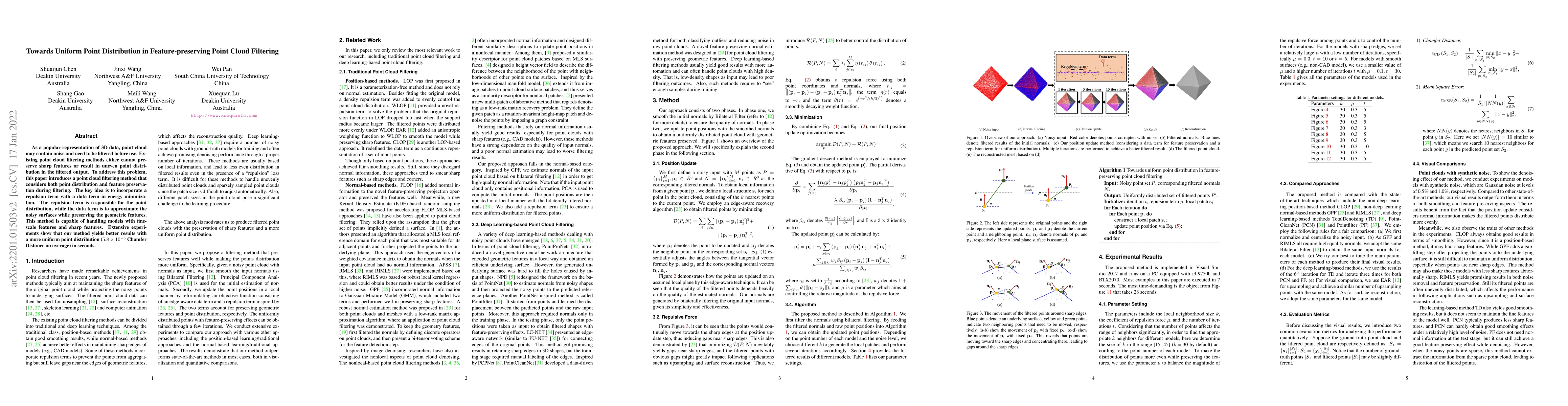 This paper proposes a novel point cloud filtering method that balances uniform point distribution and feature preservation. It achieves this by integrating a repulsion term with an energy minimization approach, resulting in better handling of fine-scale and sharp features, and demonstrating superior performance in maintaining a uniform point distribution.