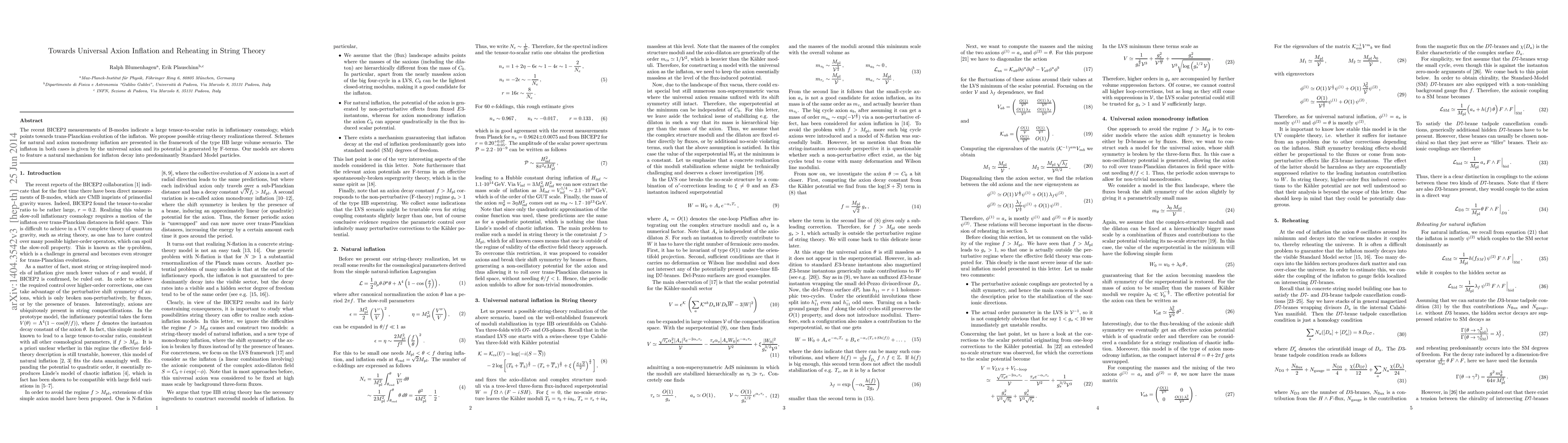 This paper proposes string-theory models for axion-driven inflation and reheating, addressing the large tensor-to-scalar ratio observed in BICEP2 measurements. It presents natural axion monodromy inflation scenarios within the type IIB large volume scenario, featuring a universal axion inflaton and a decay mechanism into Standard Model particles.