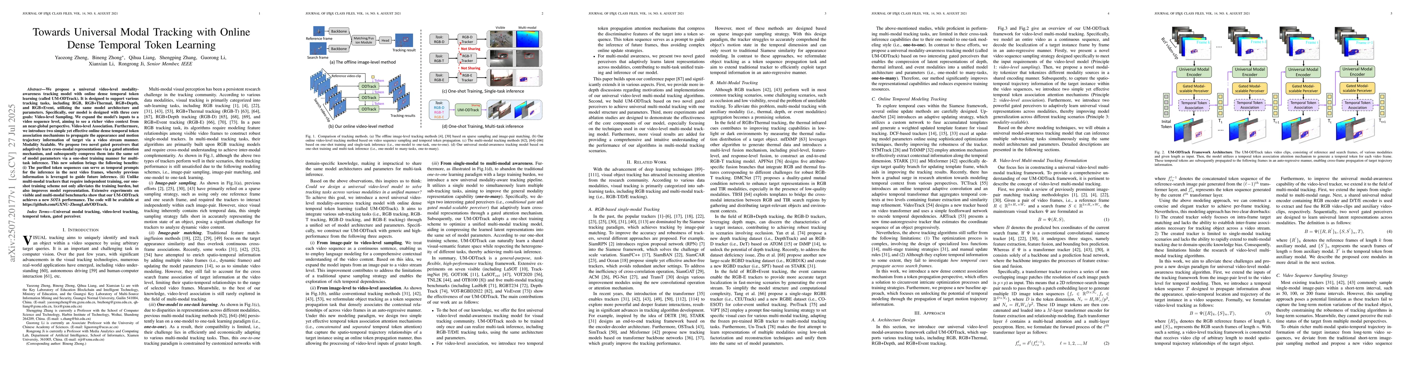 We propose a universal video-level modality-awareness tracking model with online dense temporal token learning (called {\modaltracker}). It is designed to support various tracking tasks, including RGB, RGB+Thermal, RGB+Depth, and RGB+Event, utilizing the same model architecture and parameters. Specifically, our model is designed with three core goals: \textbf{Video-level Sampling}. We expand the model's inputs to a video sequence level, aiming to see a richer video context from an near-global perspective. \textbf{Video-level Association}. Furthermore, we introduce two simple yet effective online dense temporal token association mechanisms to propagate the appearance and motion trajectory information of target via a video stream manner. \textbf{Modality Scalable}. We propose two novel gated perceivers that adaptively learn cross-modal representations via a gated attention mechanism, and subsequently compress them into the same set of model parameters via a one-shot training manner for multi-task inference. This new solution brings the following benefits: (i) The purified token sequences can serve as temporal prompts for the inference in the next video frames, whereby previous information is leveraged to guide future inference. (ii) Unlike multi-modal trackers that require independent training, our one-shot training scheme not only alleviates the training burden, but also improves model representation. Extensive experiments on visible and multi-modal benchmarks show that our {\modaltracker} achieves a new \textit{SOTA} performance. The code will be available at https://github.com/GXNU-ZhongLab/ODTrack.