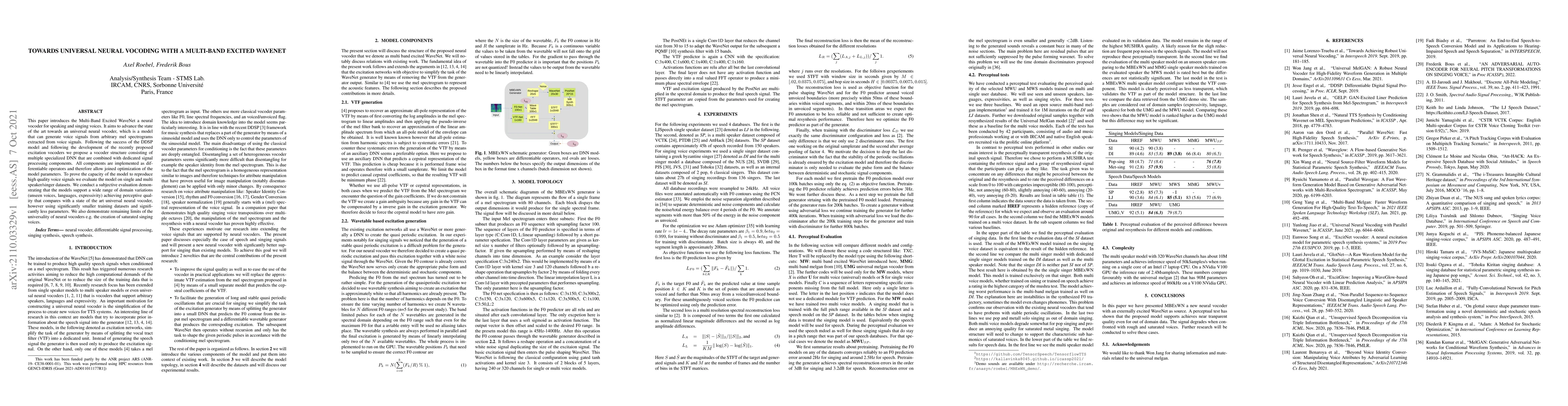 This paper introduces the Multi-Band Excited WaveNet a neural vocoder for speaking and singing voices. It aims to advance the state of the art towards an universal neural vocoder, which is a model that can generate voice signals from arbitrary mel spectrograms extracted from voice signals. Following the success of the DDSP model and following the development of the recently proposed excitation vocoders we propose a vocoder structure consisting of multiple specialized DNN that are combined with dedicated signal processing components. All components are implemented as differentiable operators and therefore allow joined optimization of the model parameters. To prove the capacity of the model to reproduce high quality voice signals we evaluate the model on single and multi speaker/singer datasets. We conduct a subjective evaluation demonstrating that the models support a wide range of domain variations (unseen voices, languages, expressivity) achieving perceptive quality that compares with a state of the art universal neural vocoder, however using significantly smaller training datasets and significantly less parameters. We also demonstrate remaining limits of the universality of neural vocoders e.g. the creation of saturated singing voices.