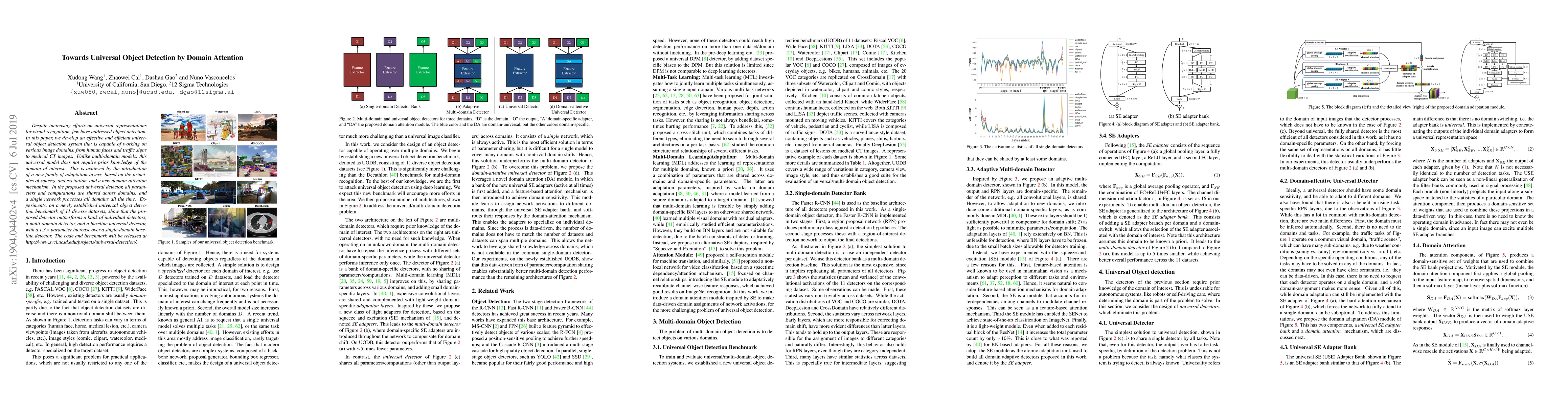 This paper proposes a universal object detection system that leverages domain attention and adaptation layers to detect objects across diverse image domains without prior domain knowledge. The model shares parameters and computations across domains, achieving superior performance compared to individual and multi-domain detectors.