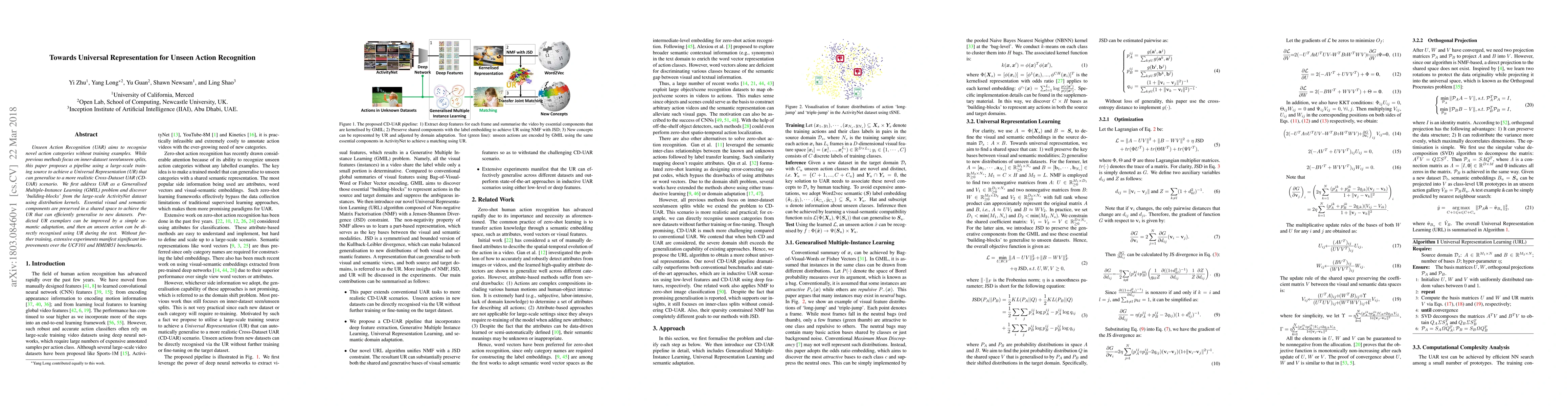 This research introduces a method for Unseen Action Recognition (UAR) in video data, aiming to identify novel actions without prior training examples. By leveraging a large-scale ActivityNet dataset, the paper proposes a 'Universal Representation' (UR) that generalizes across different datasets, significantly outperforming existing methods on UCF101 and HMDB51 benchmarks.